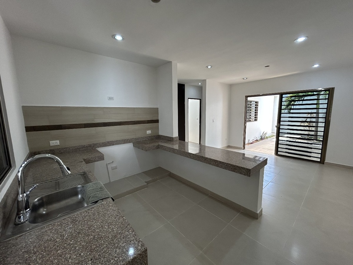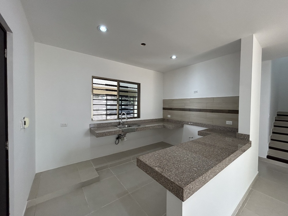 โ—ฝ Cocina con barra desayunador y mesetas de granito cappuccino.