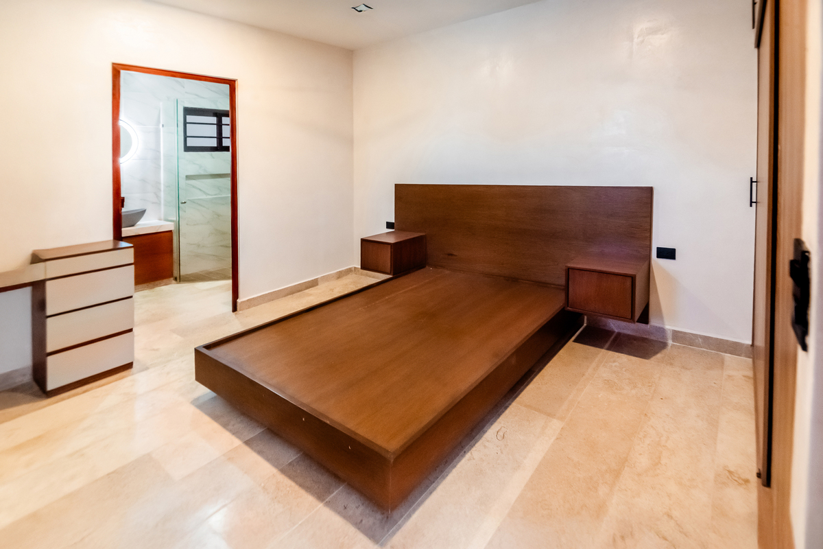 ✔ 1 cama de madeira com cabeceira e mesas de cabeceira (sem colchão)