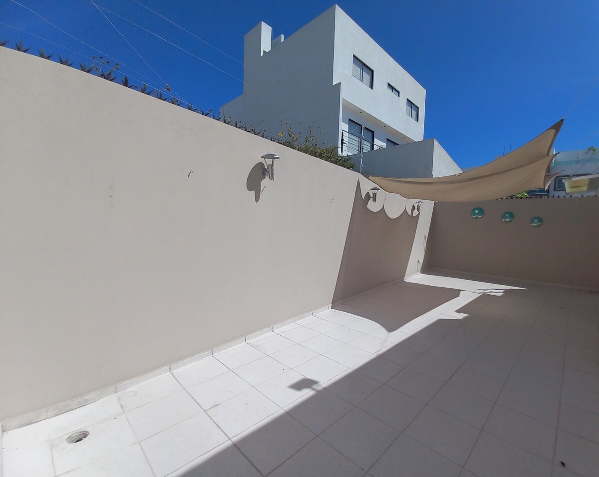 Patio trasero con pérgola y piso cerámico