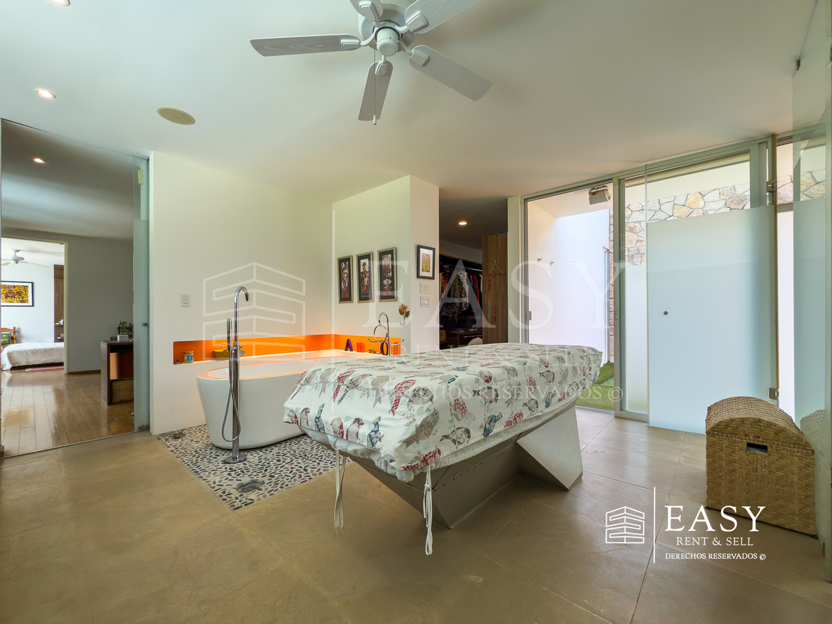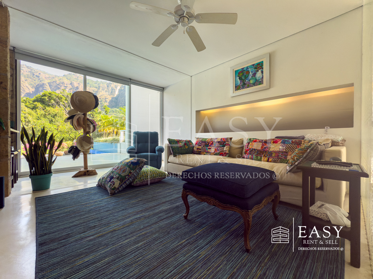 La casa principal cuenta con 3 recámaras, incluyendo una master bedroom con estudio, vestidor, baño completo y terraza privada. Las otras dos recámaras también tienen vestidor y baño completo. El espacioso salón de estar, el comedor, la sala de TV, y una gran terraza con vistas panorámicas al Tepozteco, hacen de esta casa un lugar perfecto para el descanso. Además, cuenta con una zona de meditación y área de juegos infantiles.