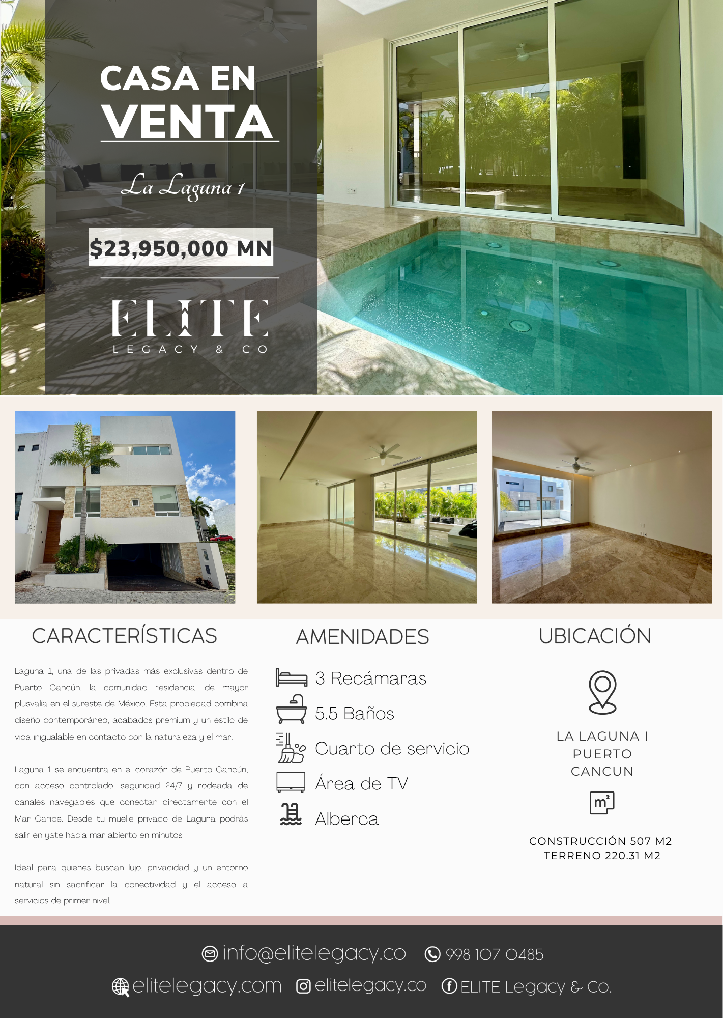 Laguna 1, una de las privadas más exclusivas dentro de Puerto Cancún, la comunidad residencial de mayor plusvalía en el sureste de México. Esta propiedad combina diseño contemporáneo, acabados premium y un estilo de vida inigualable en contacto con la naturaleza y el mar.