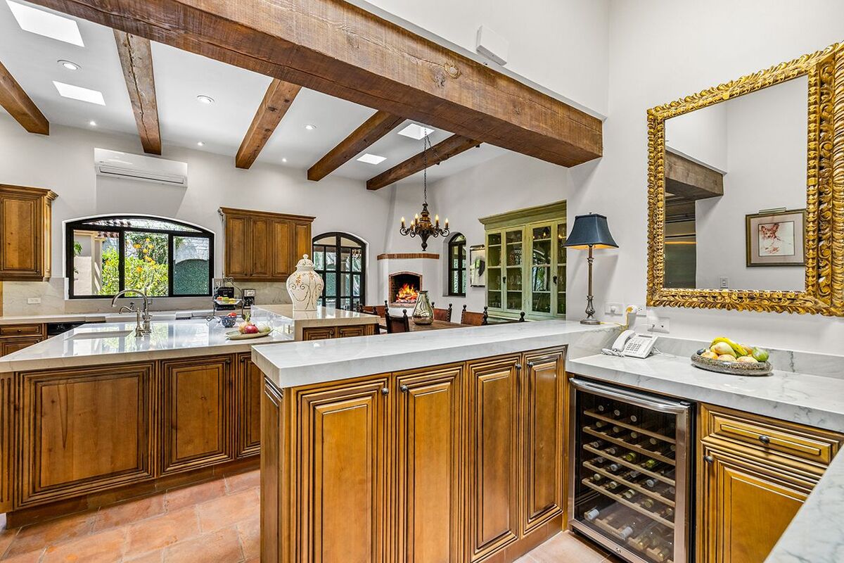 The spacious interiors are ideal for daily life and entertaining. The primary suite offers heated floors for year-round comfort and a generous walk-in closet. The chef’s kitchen is fully equipped with new quartzite countertops and top-of-the-line appliances. Outdoors, the manicured gardens, enhanced by architectural lighting by Miguel Calanchini, create a serene ambiance that transitions beautifully from day to night.