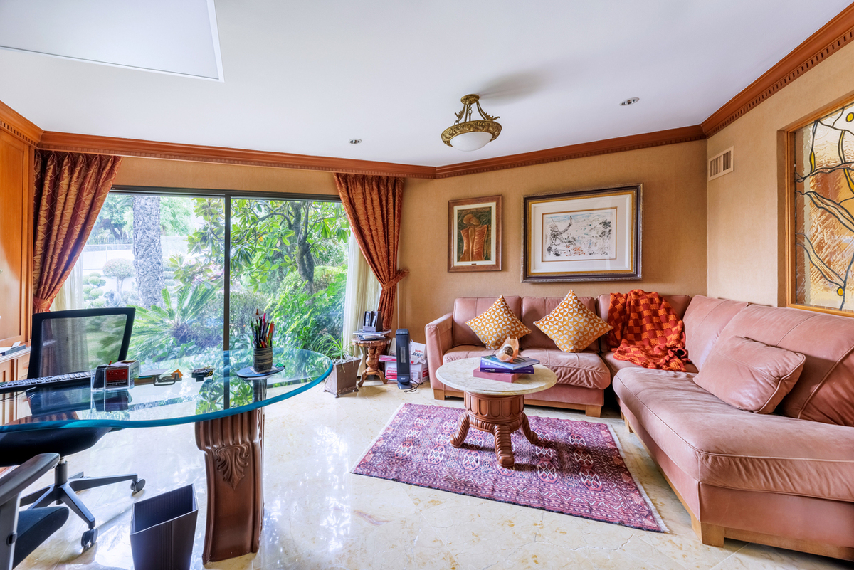 Estancia y comedor con acabados de lujo y salida al jardín.
