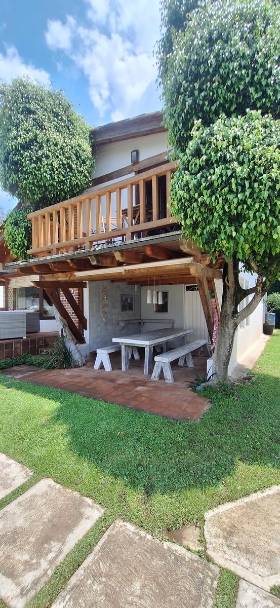 Térreo: ampla sala e jantar com pisos de madeira e detalhes artesanais, cozinha equipada com azulejos de barro e cerâmica, e um encantador quintal com área de convivência, mesa e bancos de madeira.