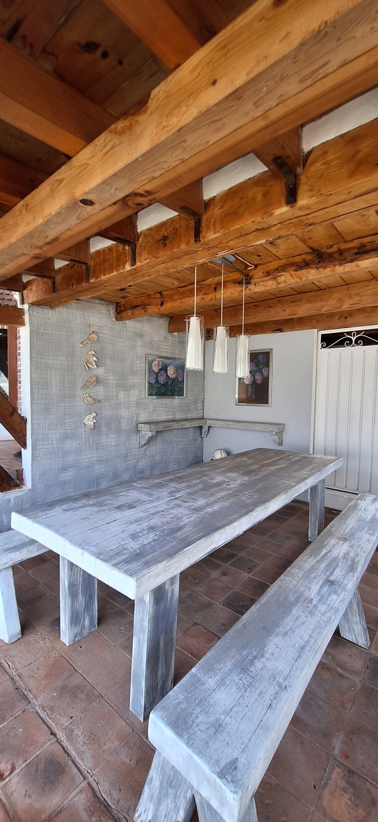 Planta baja: amplia sala y comedor con pisos de madera y detalles artesanales, cocina equipada con loseta de barro y azulejo, y un encantador patio trasero con área de convivencia, mesa y bancas de madera.