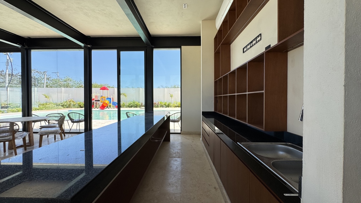 Planta baja: Sala, comedor, cocina con isla y cubiertas de cuarzo, terraza techada, alberca, recámara con baño, cuarto de servicio, área de lavado.
