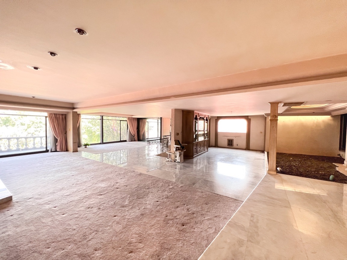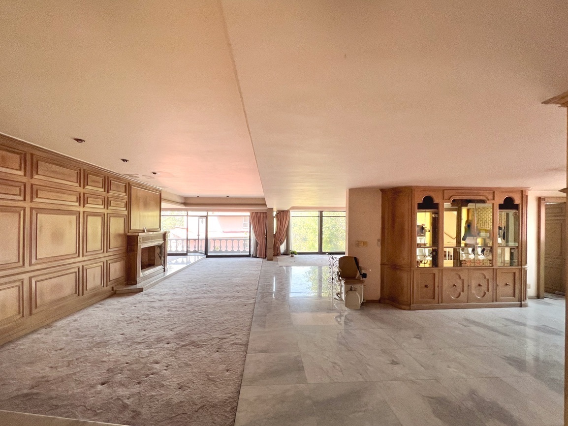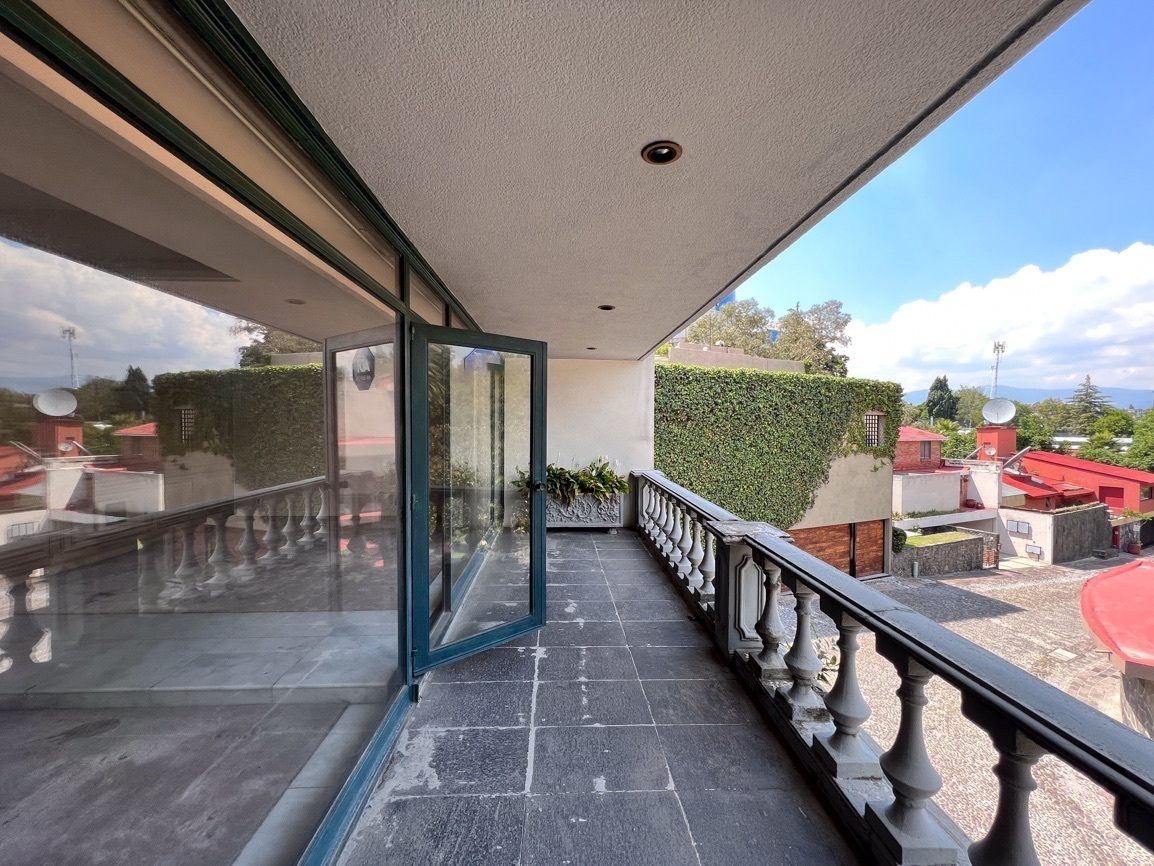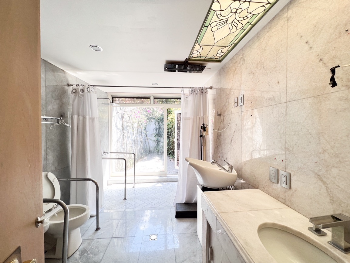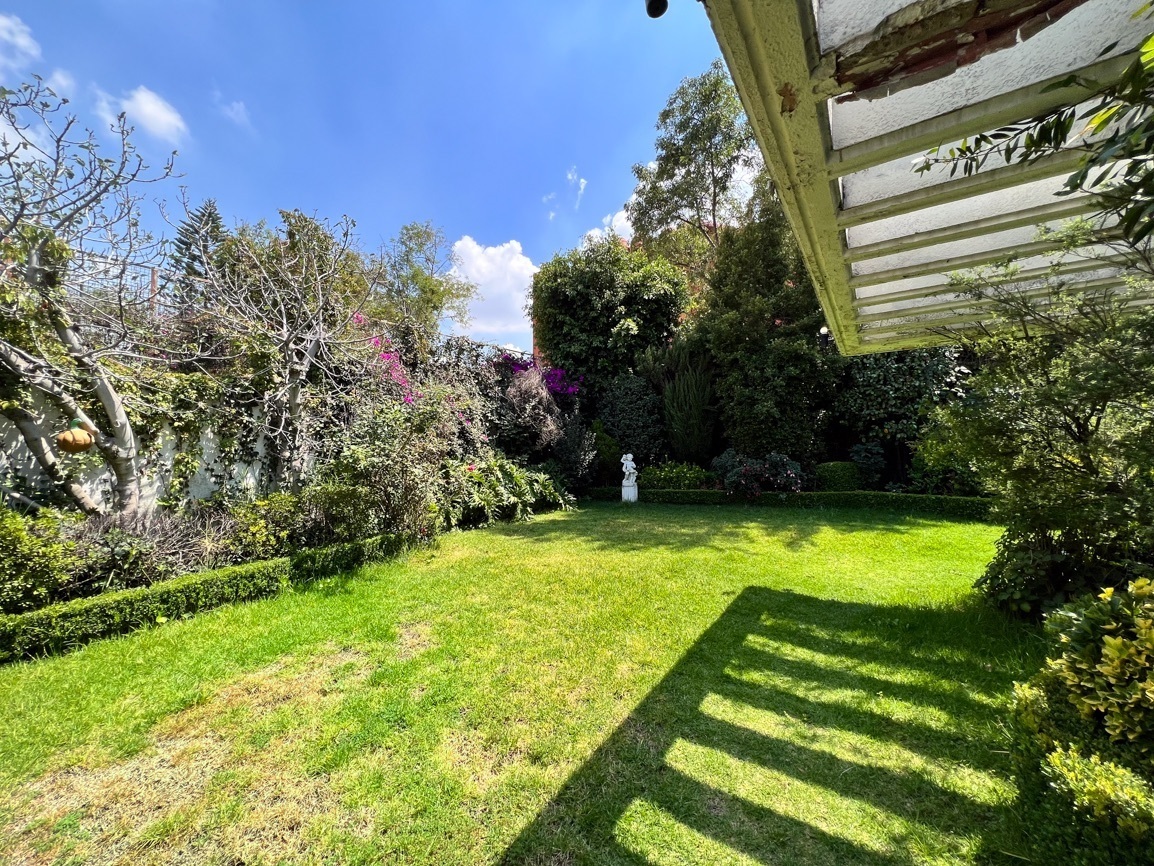 Cuenta con 4 recámaras, 3 baños y 2 medio baños. El primer piso alberga un salón social con bar y un baño de visitas. El segundo piso ofrece un área de sala-comedor espaciosa, recámaras con vistas al jardín, un estudio, cocina, antecomedor y un área adicional para una cuarta recámara. El sótano incluye 5 estacionamientos, cuarto de servicio, lavandería y bodega.
