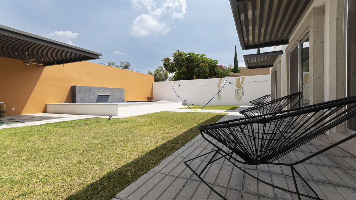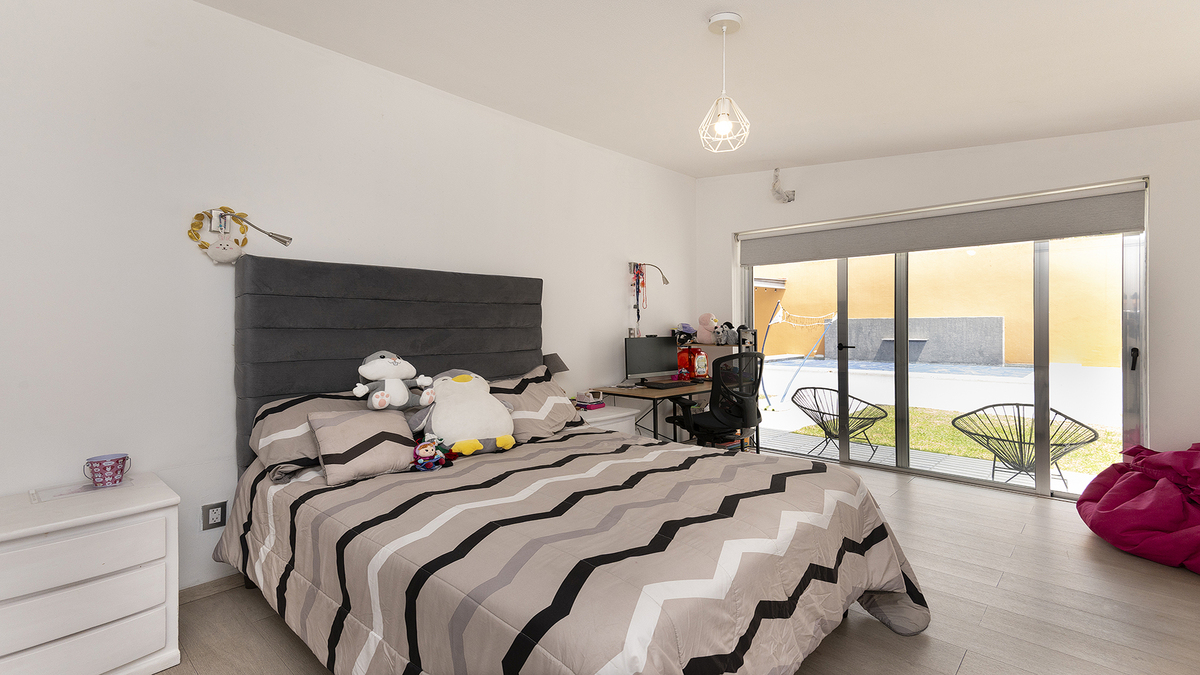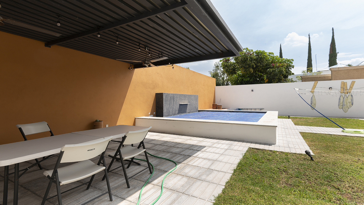El exterior de la casa no se queda atrás: un hermoso jardín con piscina te invita a relajarte y disfrutar del clima. También ofrece un cuarto de servicio, espacio de oficina fuera de la casa y una cochera con capacidad para 3 vehículos.