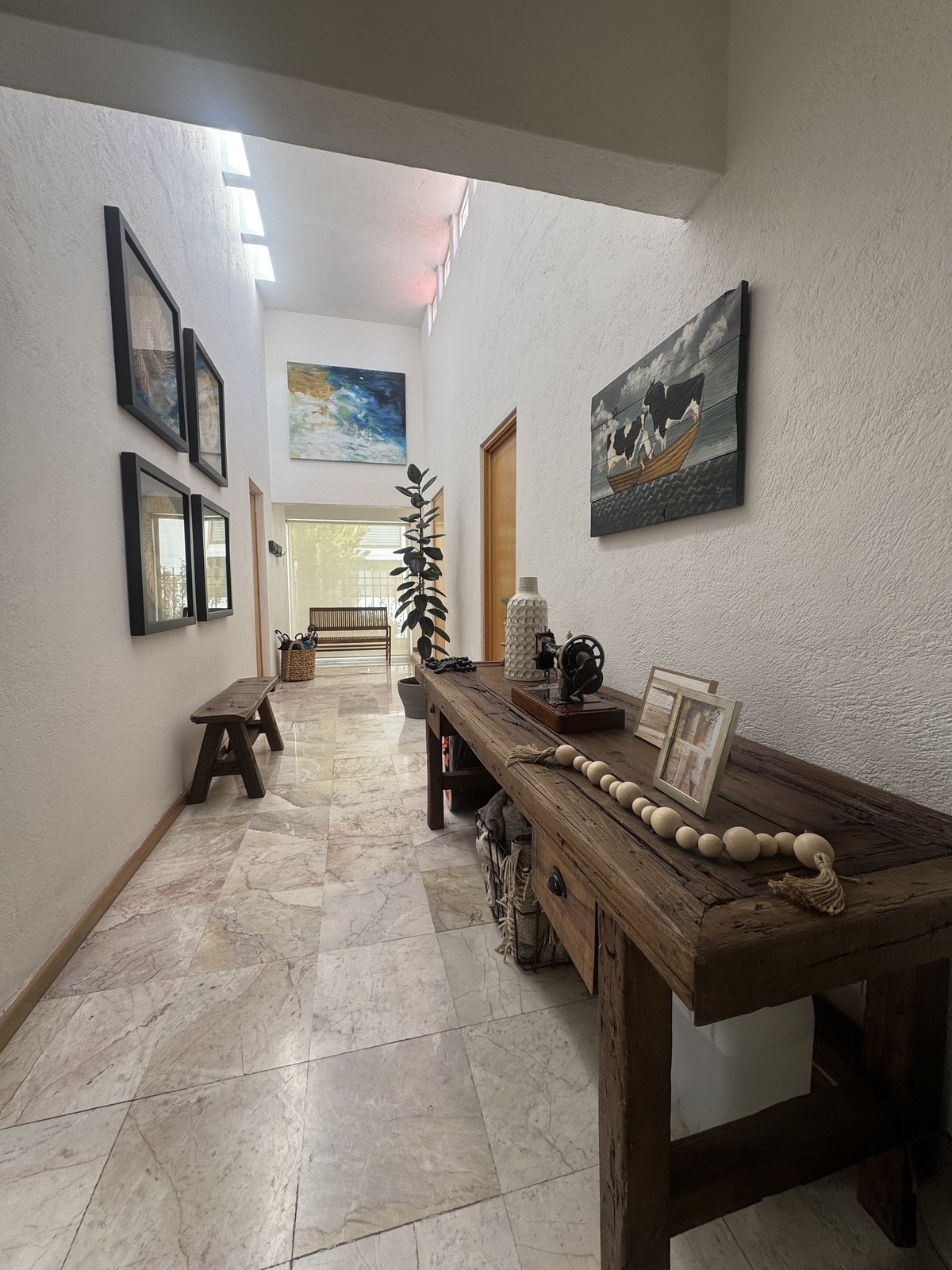 Pasillo a doble altura que conduce a las recámaras, las cuales rodean el jardín.
