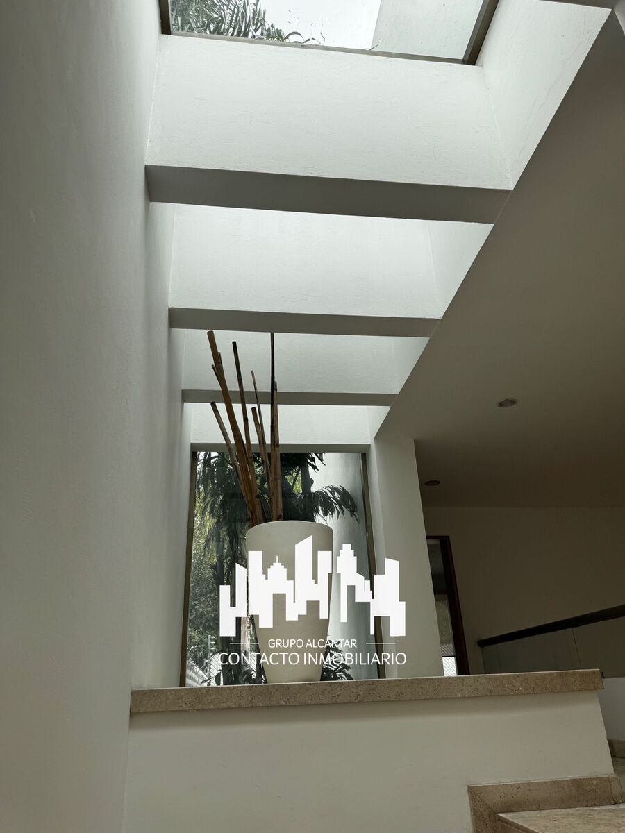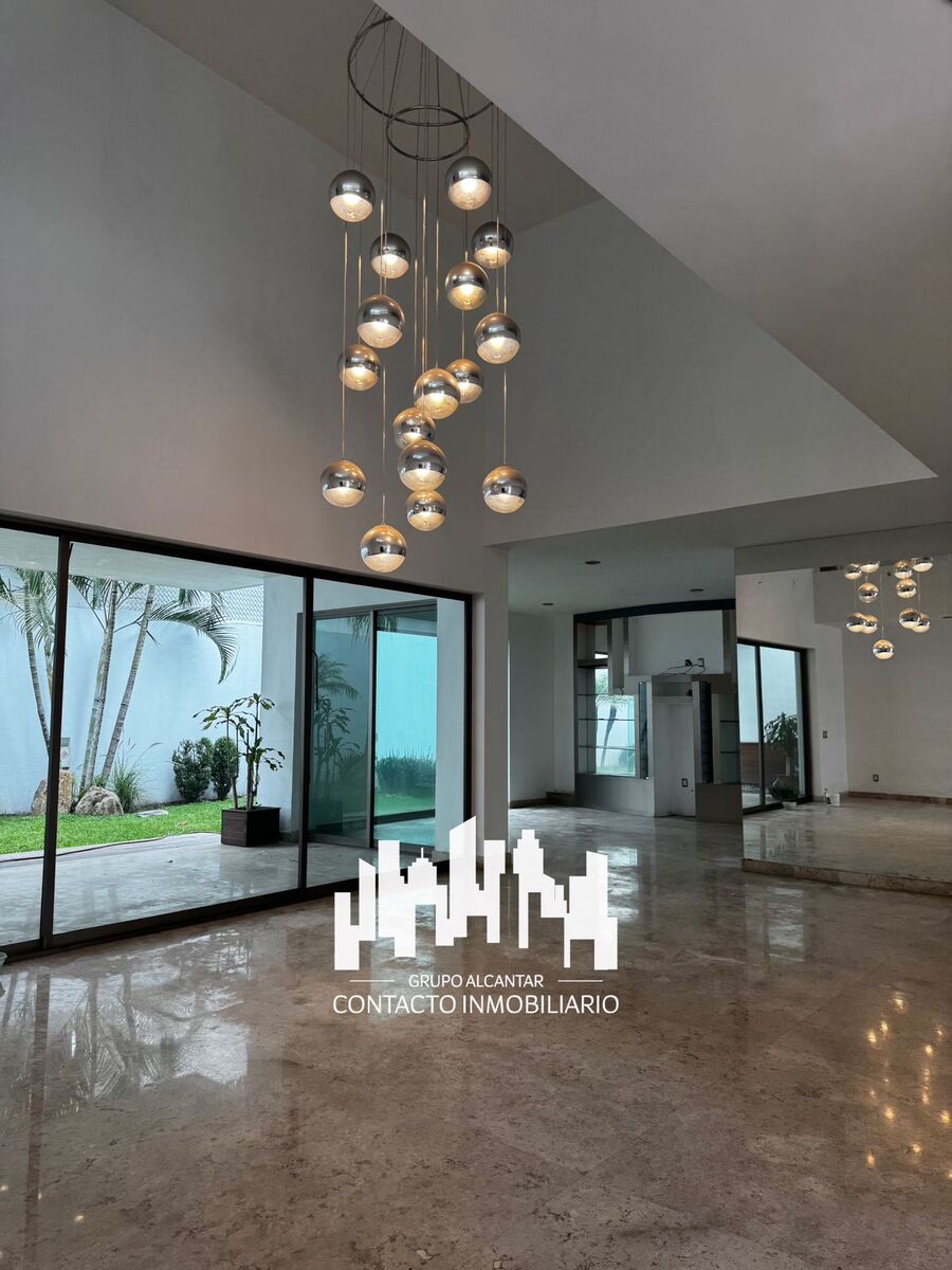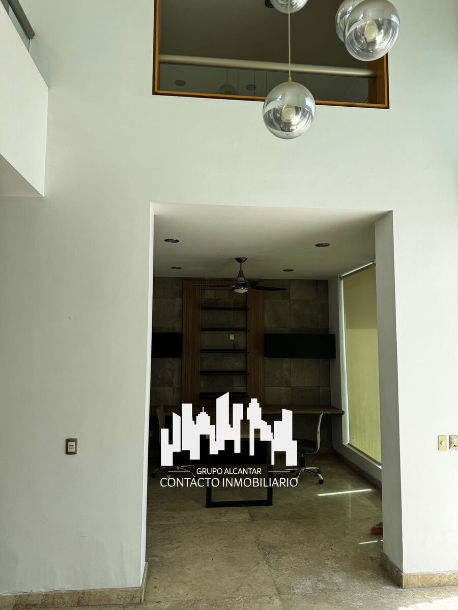 Entrada principal y entrada de servicio, sala doble altura, comedor, cocina integral muy amplia, 1 recámara con baño completo, oficina o ante sala, 1/2 baño, jardín decorativo entre cocina y recámara, terraza techada y jardín. Cuenta con escalera de caracol por la cocina para subir al cuarto de lavado.