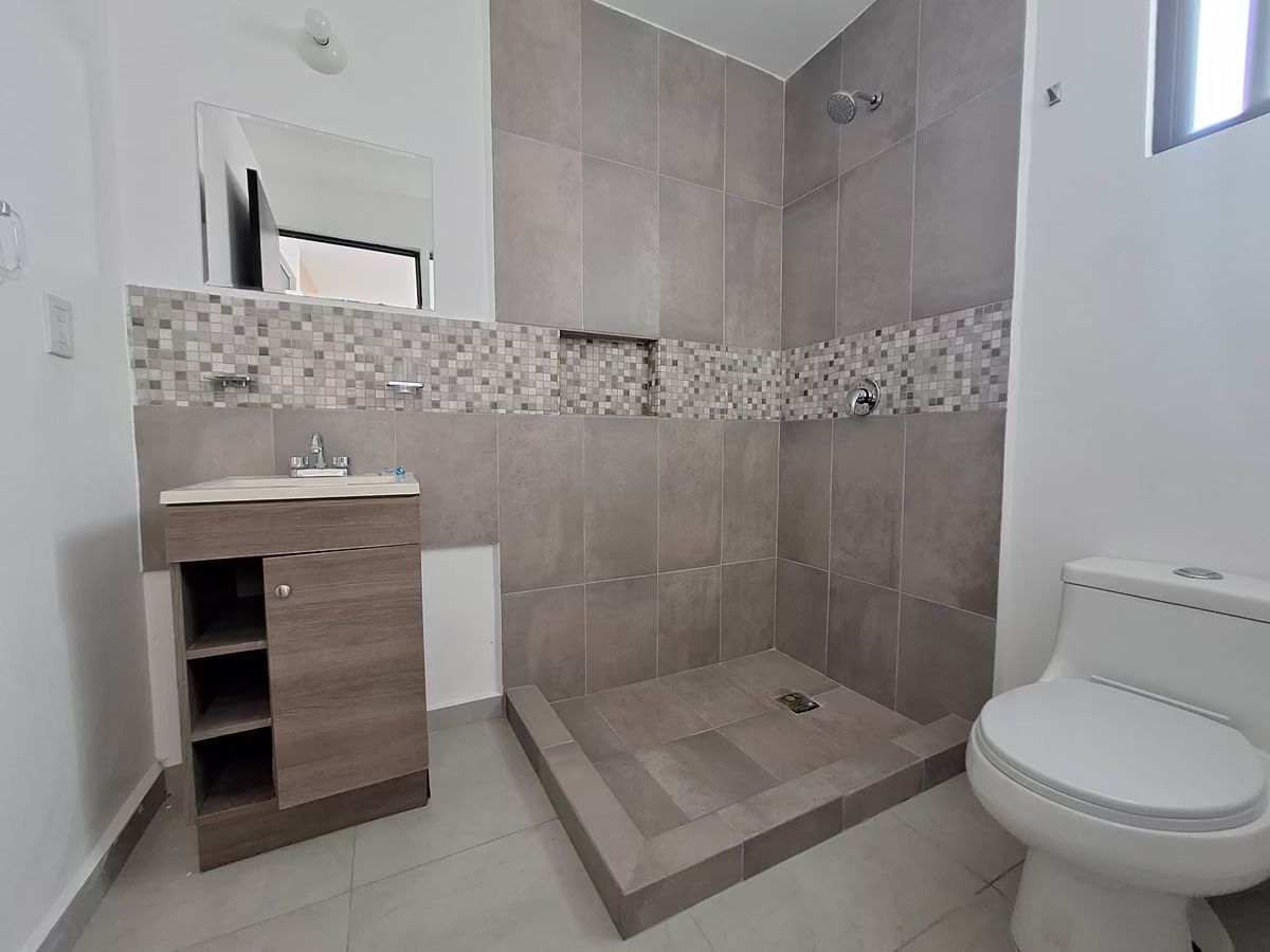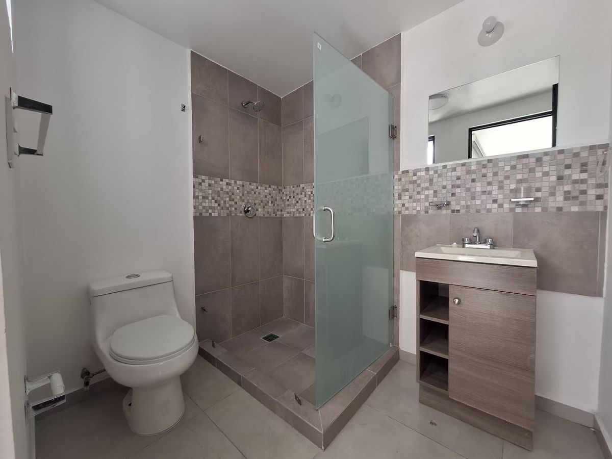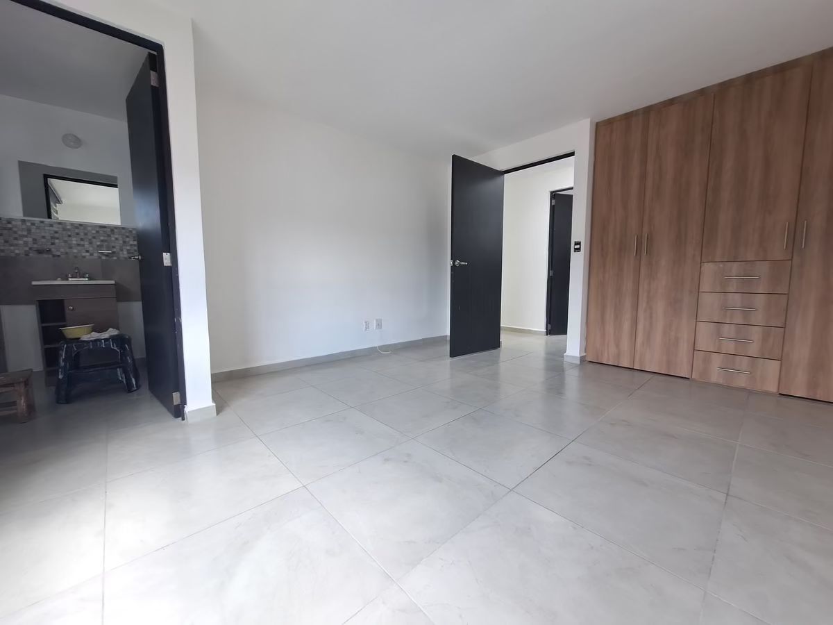 Recámara principal con clóset, piso, techo y baño completo, con cancel de cristal templado