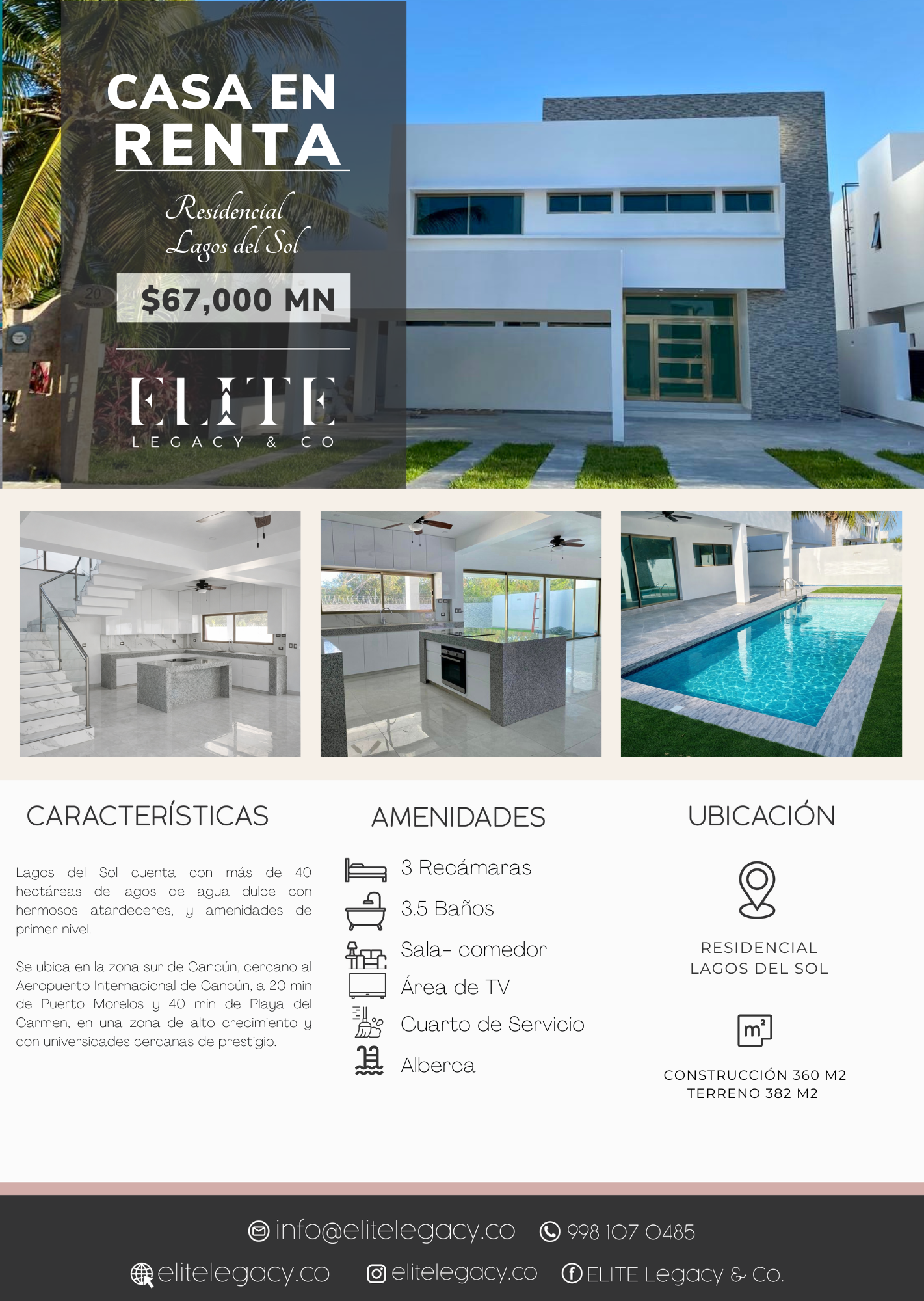Exclusiva residencia en renta en uno de los residenciales de mayor exclusividad en Cancún, Residencial Lagos del Sol.