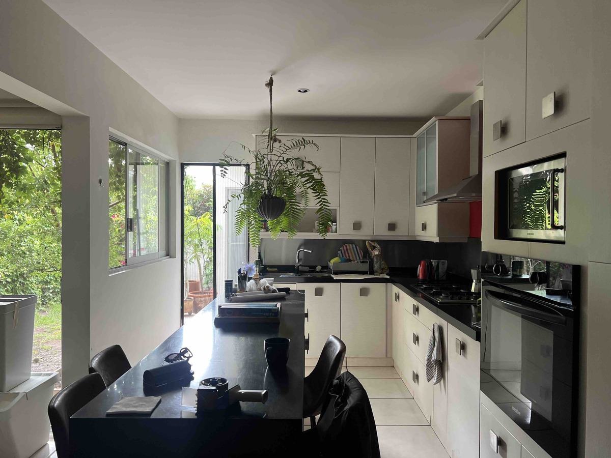 Casa de dois níveis, garagem para dois carros, ampla sala/jantar, área de TV no andar térreo, jardim, área de lavanderia externa coberta, quarto de serviço com banheiro completo, cozinha equipada com despensa, fogão e micro-ondas, balcão de café da manhã central, lavabo para visitantes.