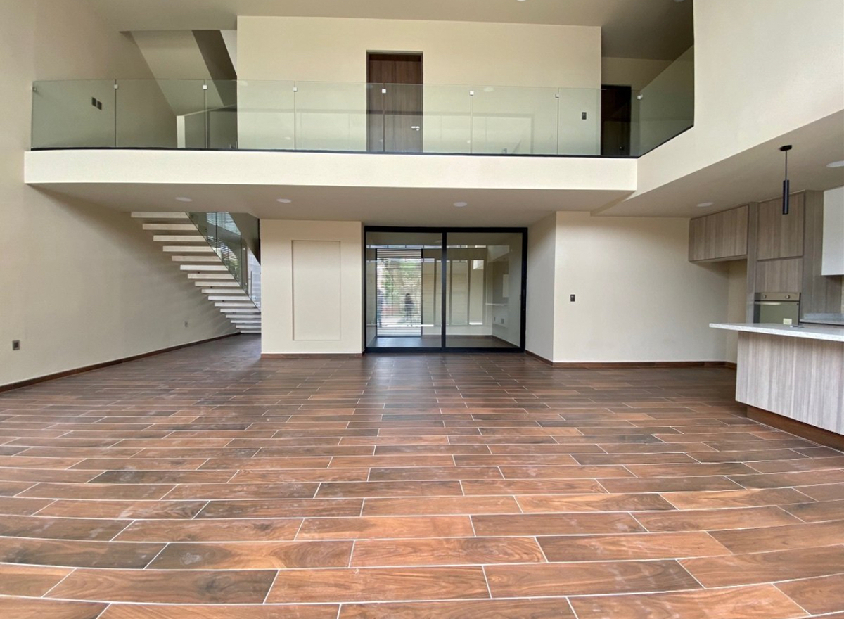 Amplia estancia para sala–comedor a doble altura con ventanales