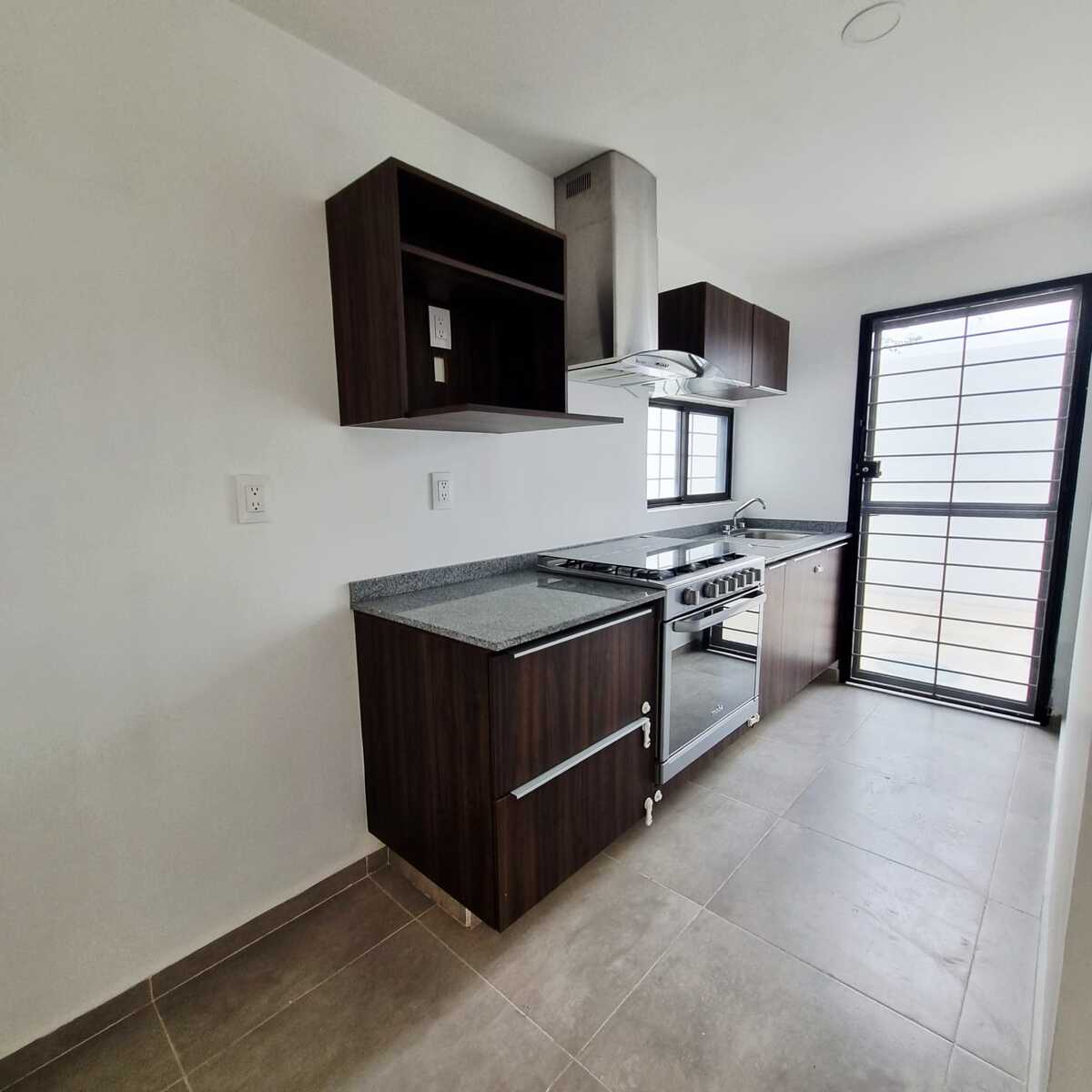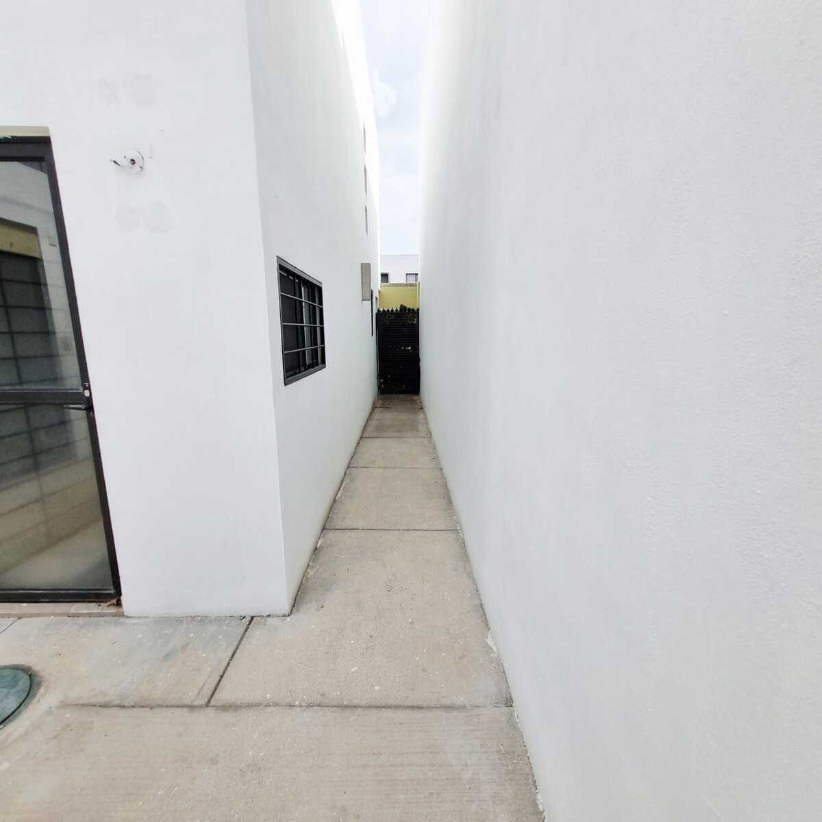 Cuenta con una amplia cochera para dos autos, cocina integral moderna, patio trasero ideal para reuniones o mascotas, y pasillo lateral que brinda mayor ventilación y acceso independiente.