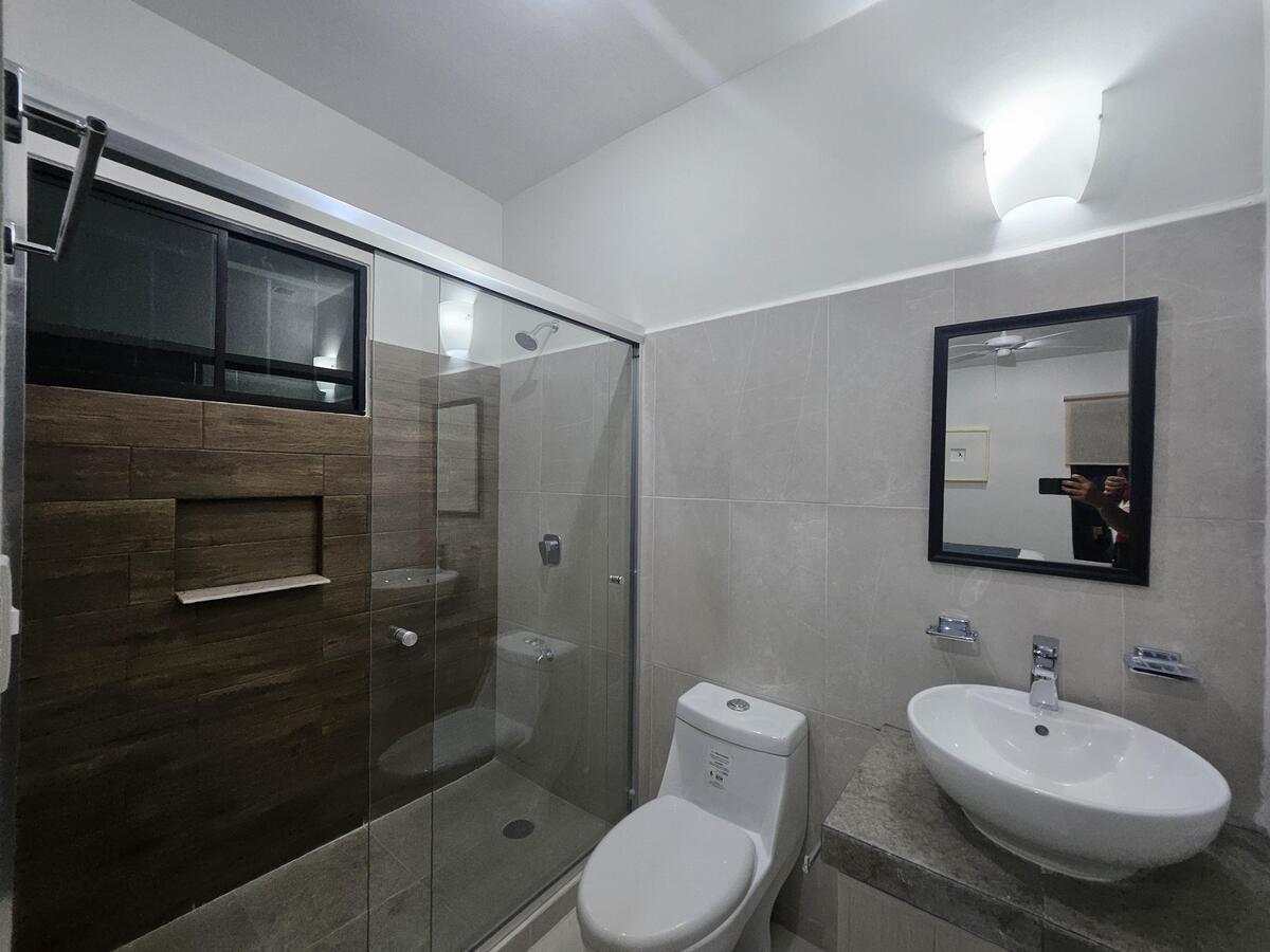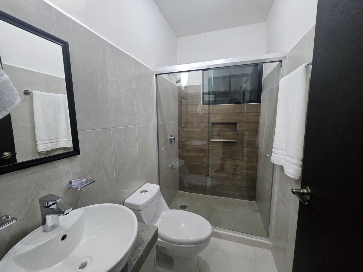 Baño completo con cancelería de vidrio templado, gabinete, monomandos y acabados de lujo