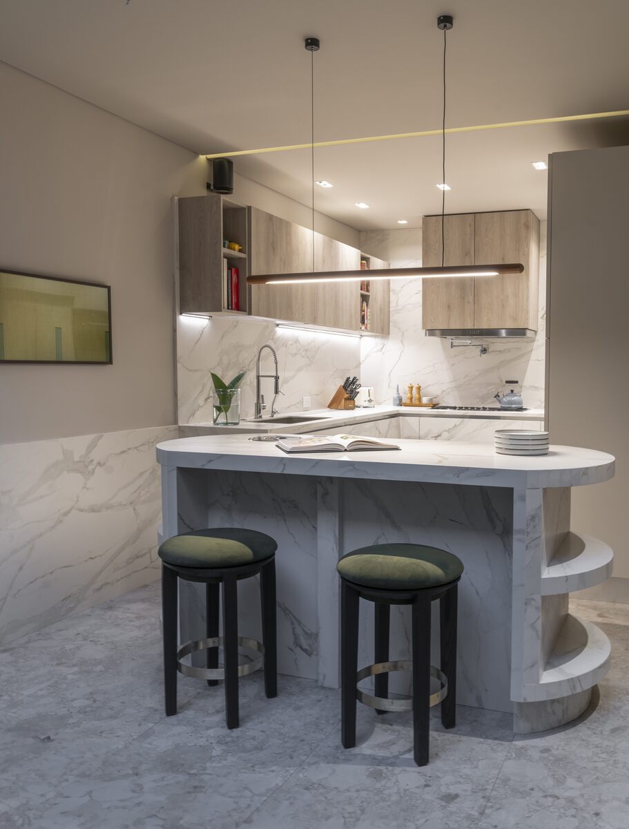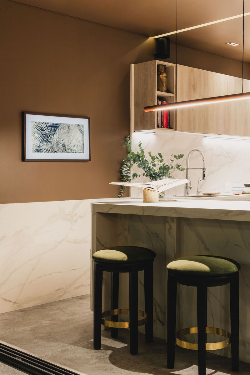 No andar térreo, os espaços sociais se desdobram: sala, sala de jantar e uma cozinha italiana equipada com bancada e frente em pedra tecnológica, acompanhada de uma ampla despensa e uma íntima estação de café. A partir daí, você acessa o terraço externo com área de jantar, ideal para jantares ao ar livre, enquanto um banheiro social complementa esta área. O estacionamento interno é projetado para um carro.