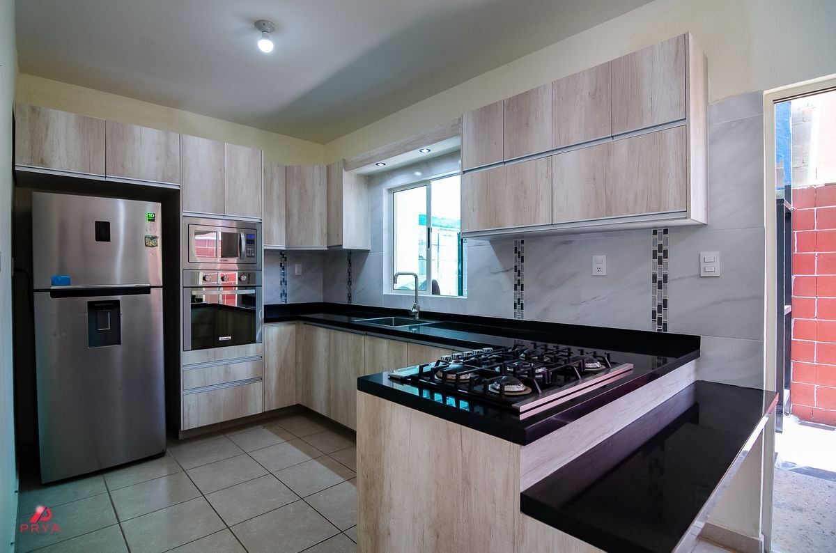 • Planta Baja: Cochera para 2 autos, servidumbre lateral, $1/2$ baño, y una cocina integral con cubierta de granito, equipada con horno y microondas.