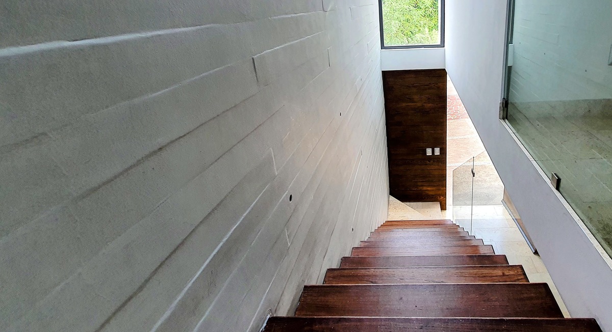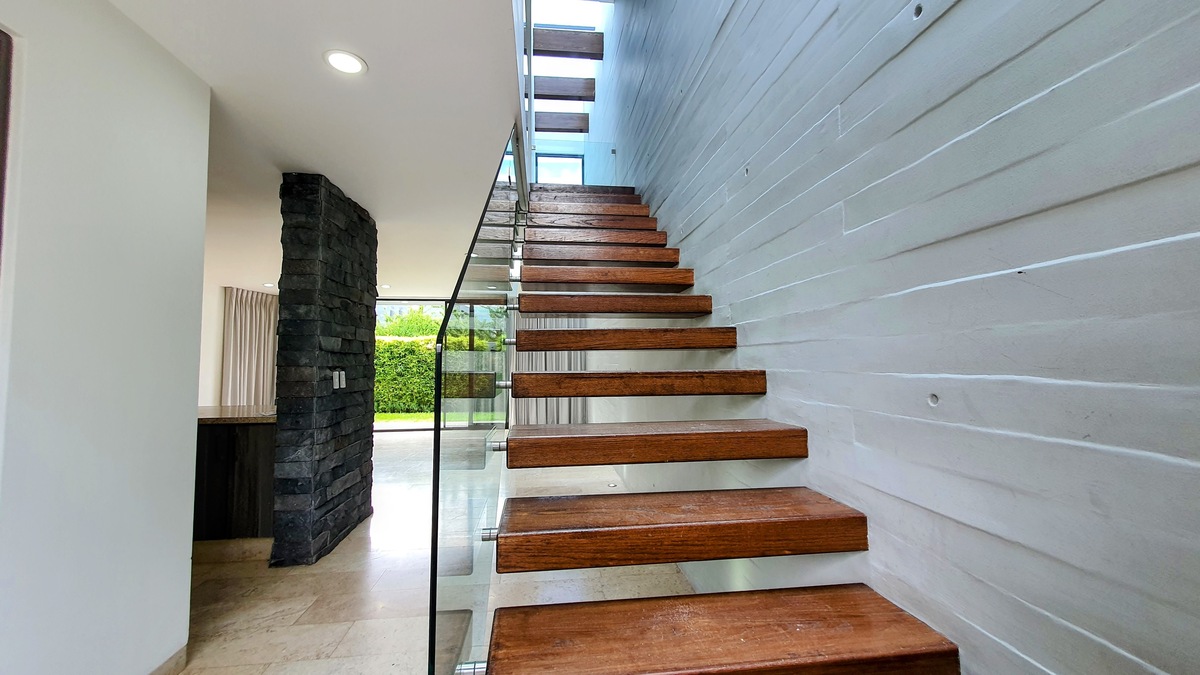 Escaleras de madera, piso de mármol, muro de piedra, cocina de granito.