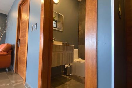 Meio banheiro externo, ideal para eventos ou reuniões ao ar livre.