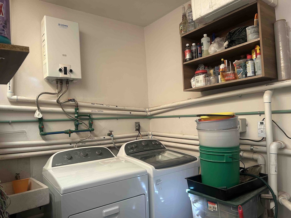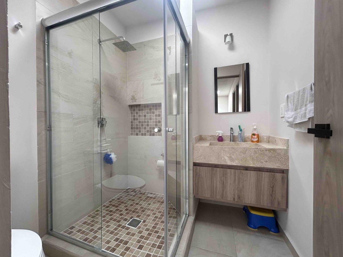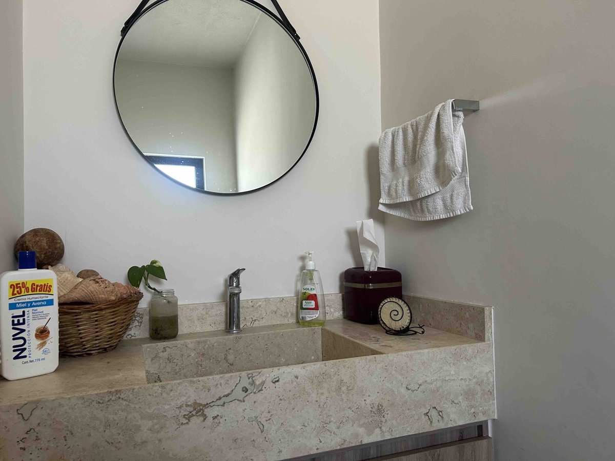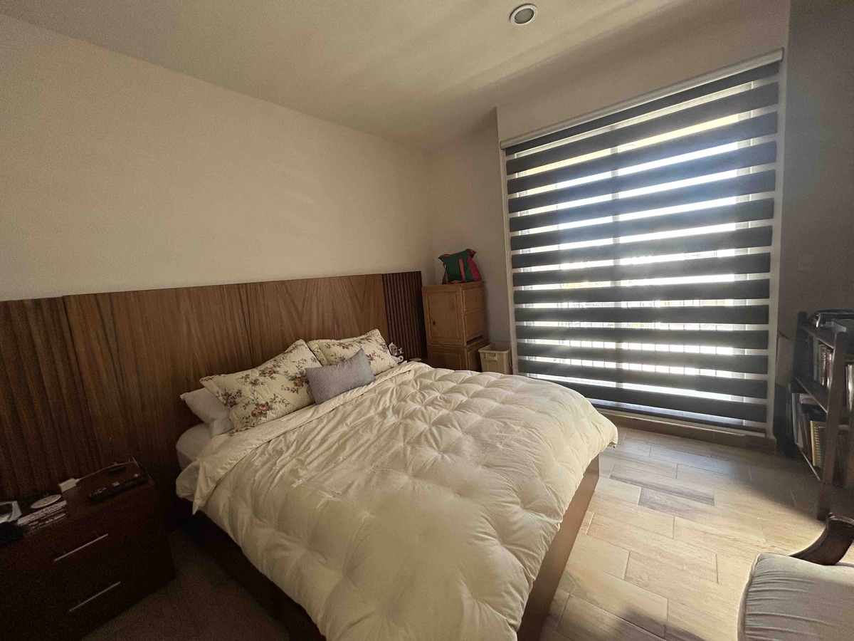 Recámara principal con vestidor, baño completo con doble lavamanos.