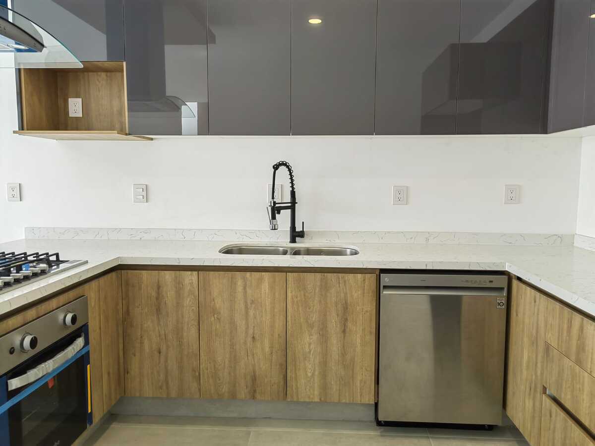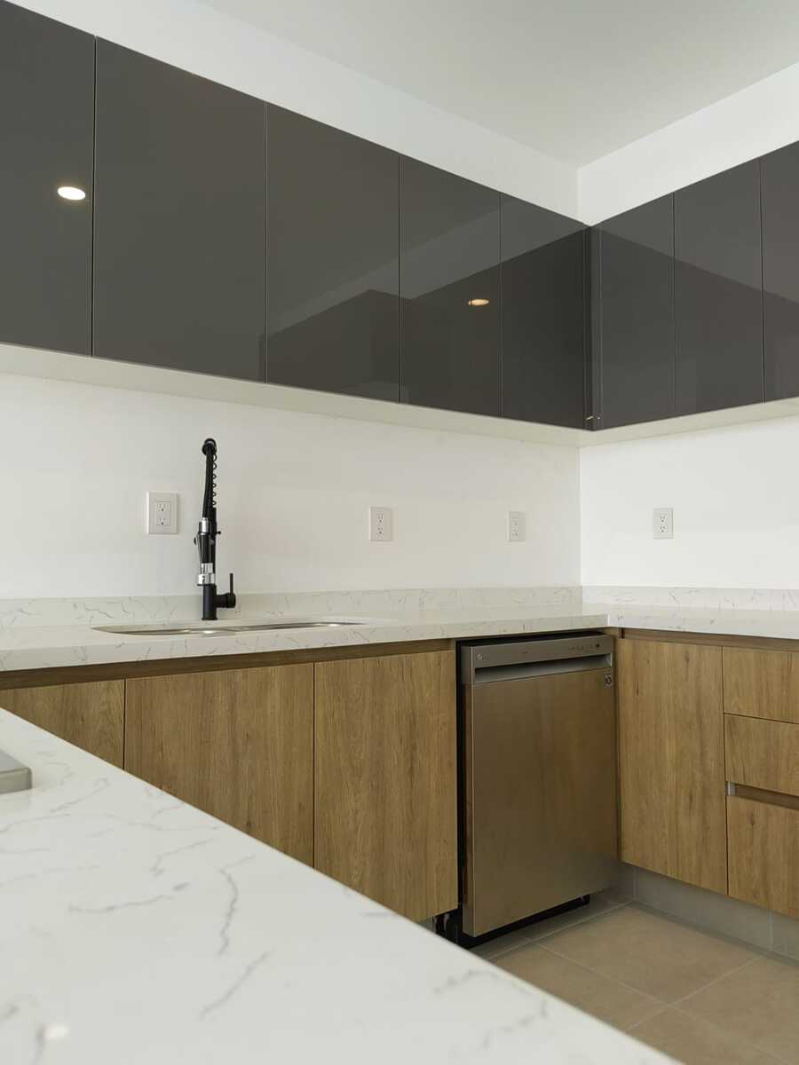 Cocina integral con cubiertas de cuarzo, lavavajillas y campana decorativa 🍳