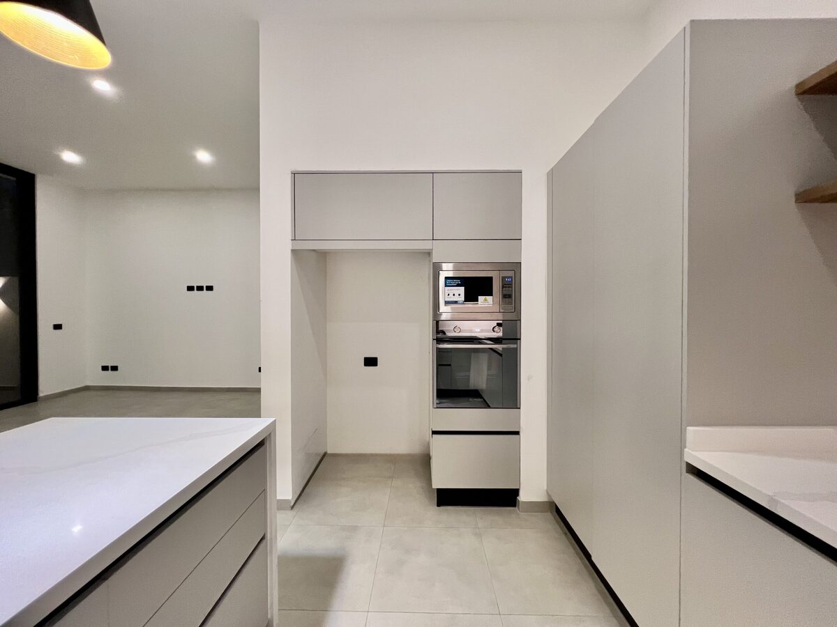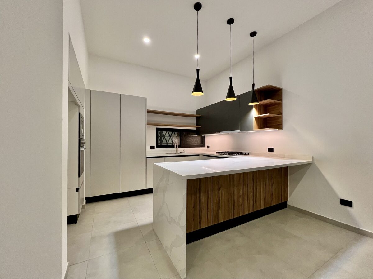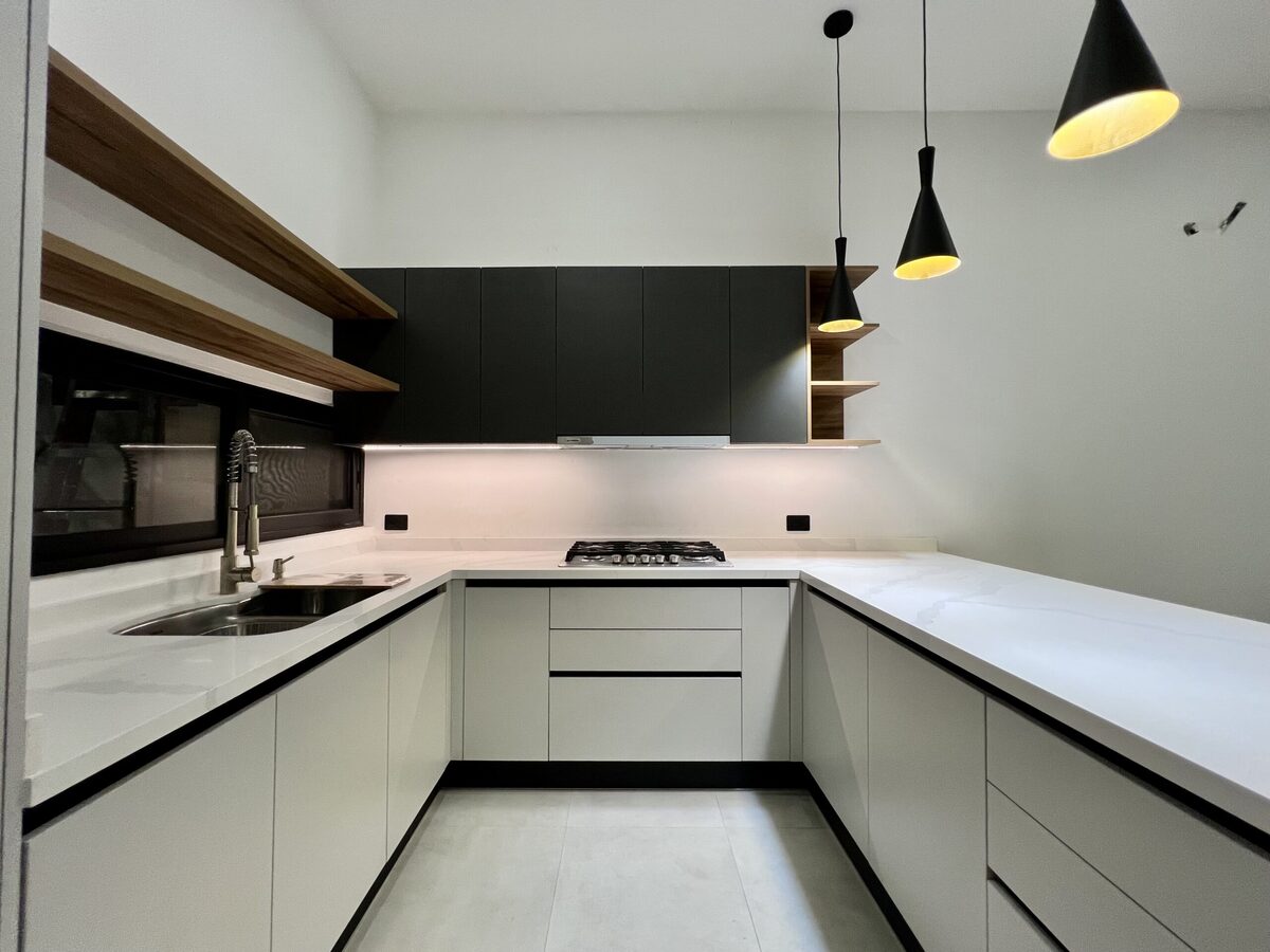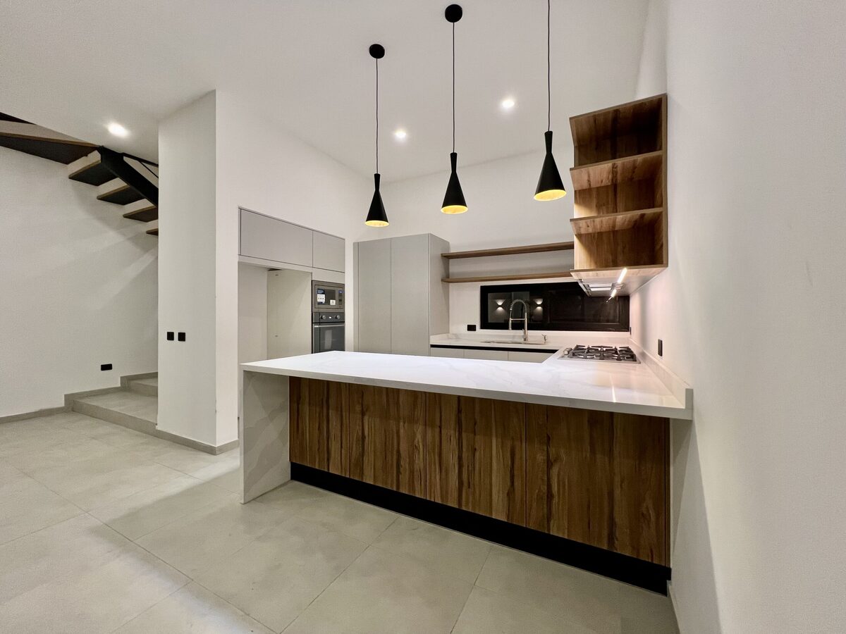 Cocina integral con barra de cuarzo equipada con parrilla, campana, horno de gas y microondas marca "IO Mabe".