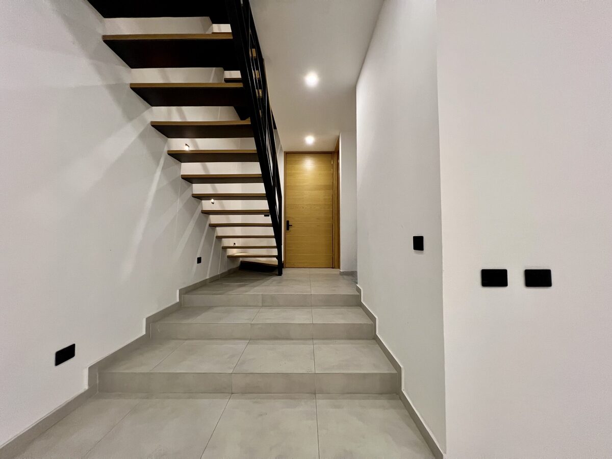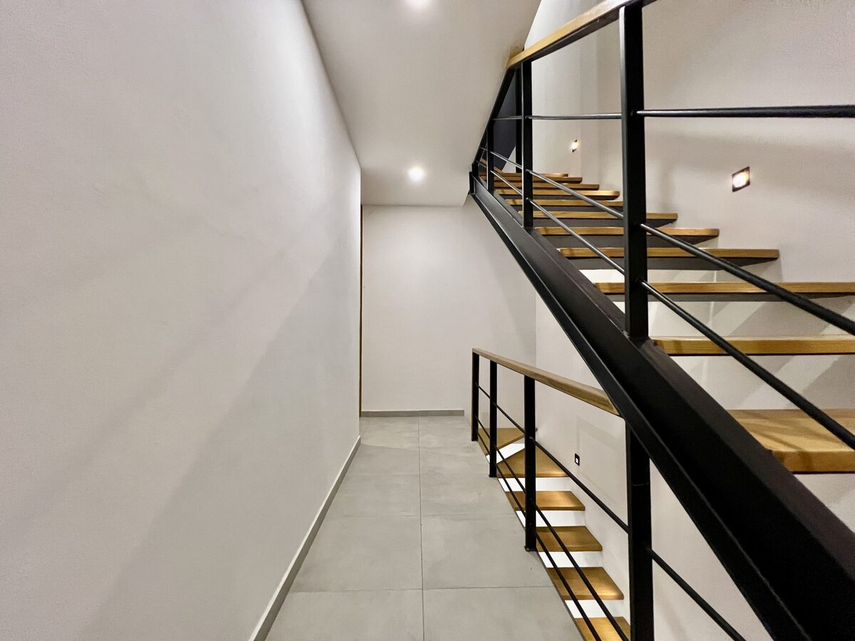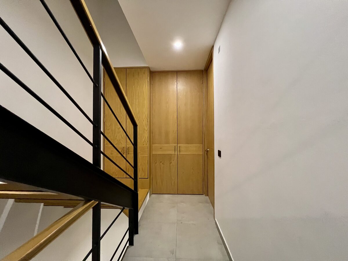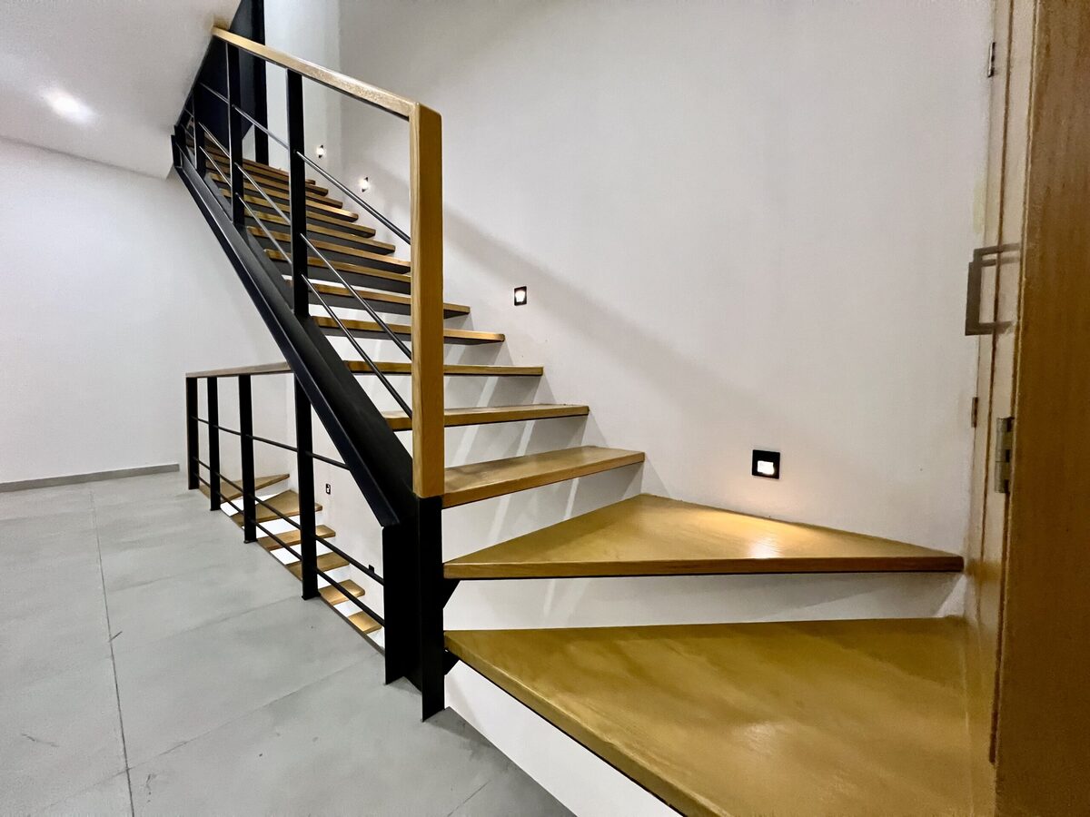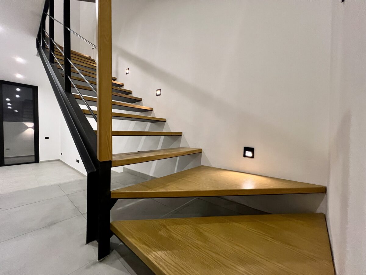 Escaleras metálicas con huellas de madera de encino e iluminación de cortesía.