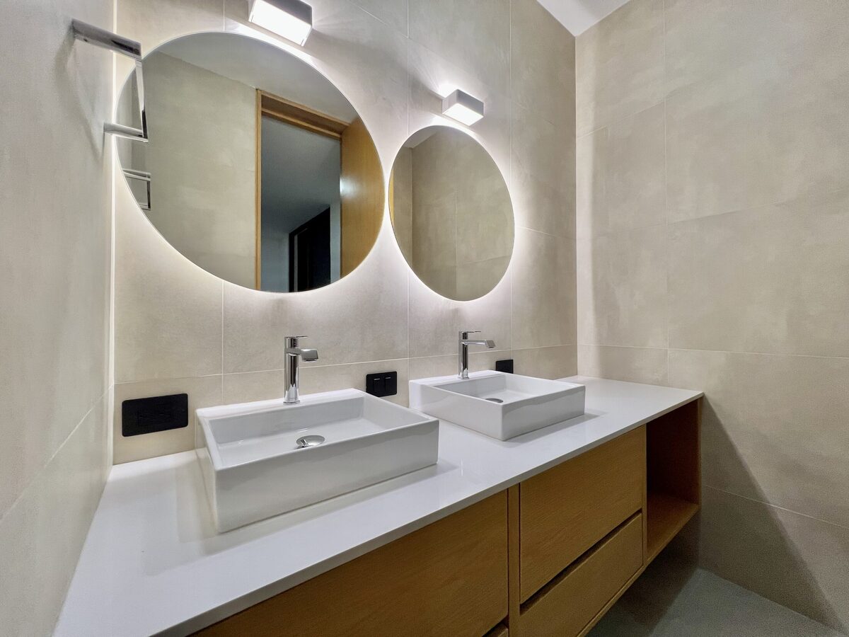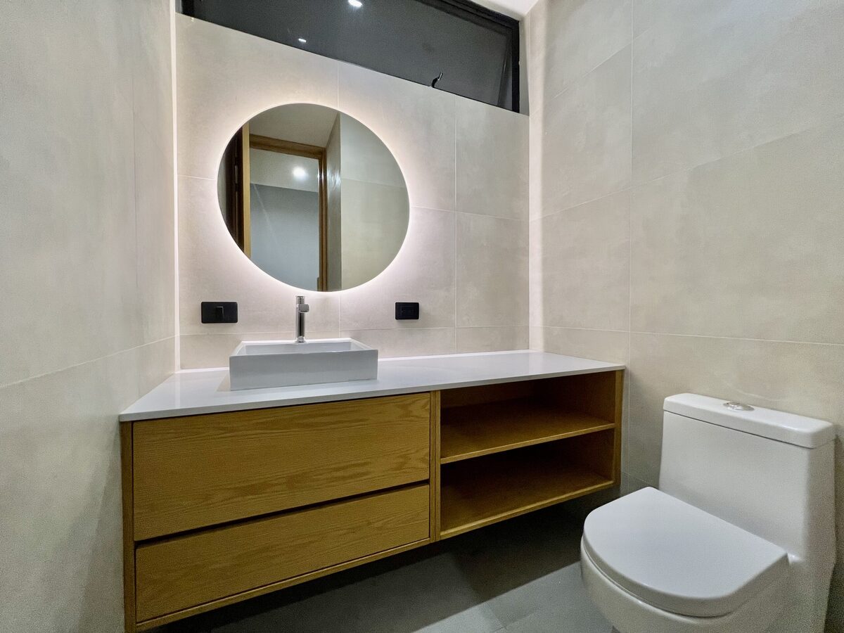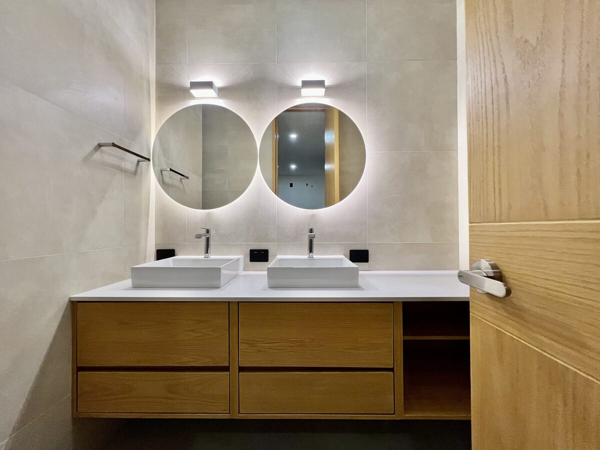 Carpintería de encino y cubiertas de cuarzo en baños.