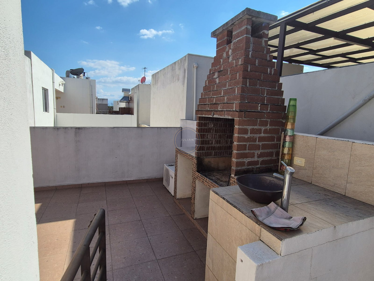 Tercera planta: baño completo y area de almacen, terraza, asador, mesa con 4 sillas, habitación.