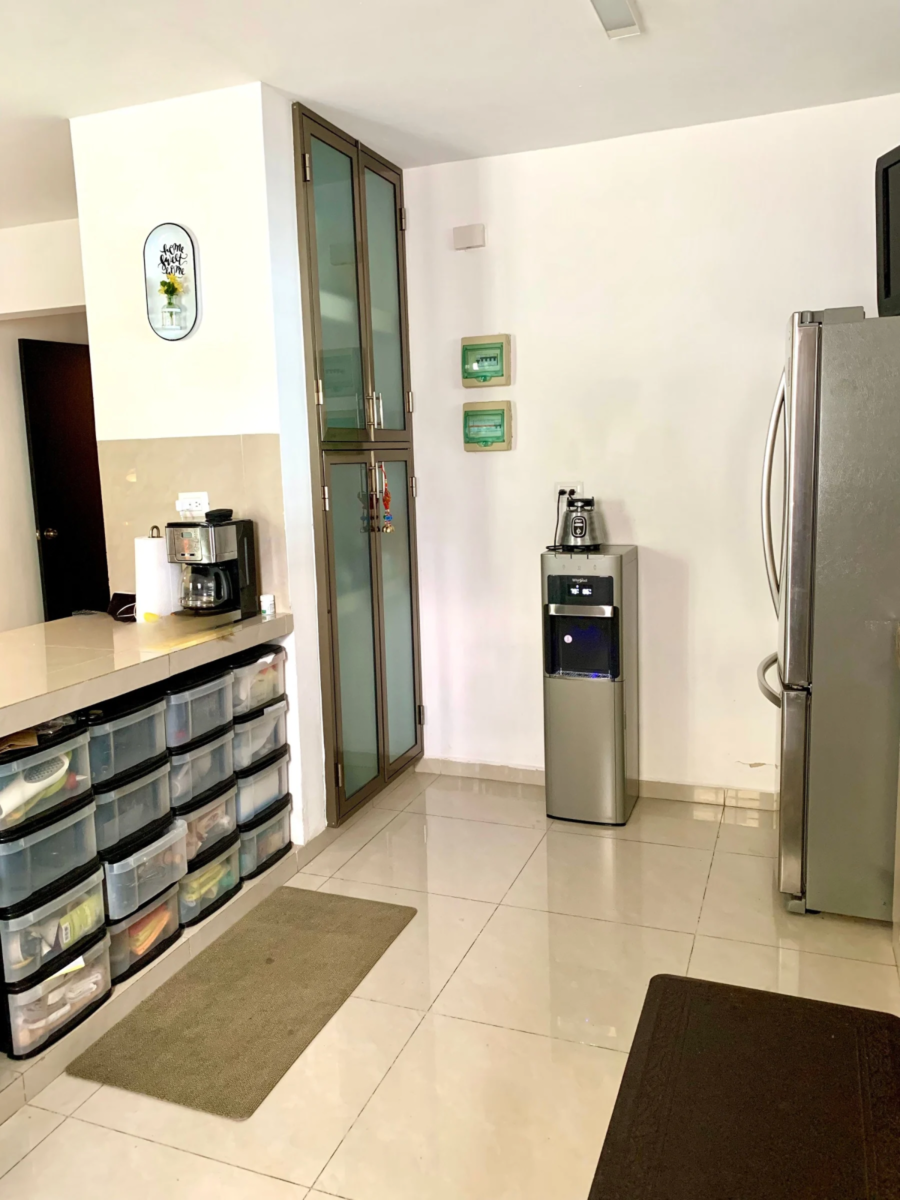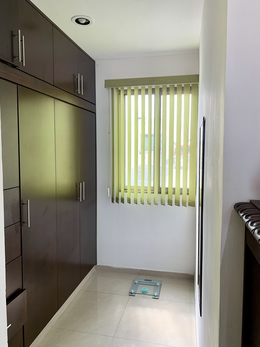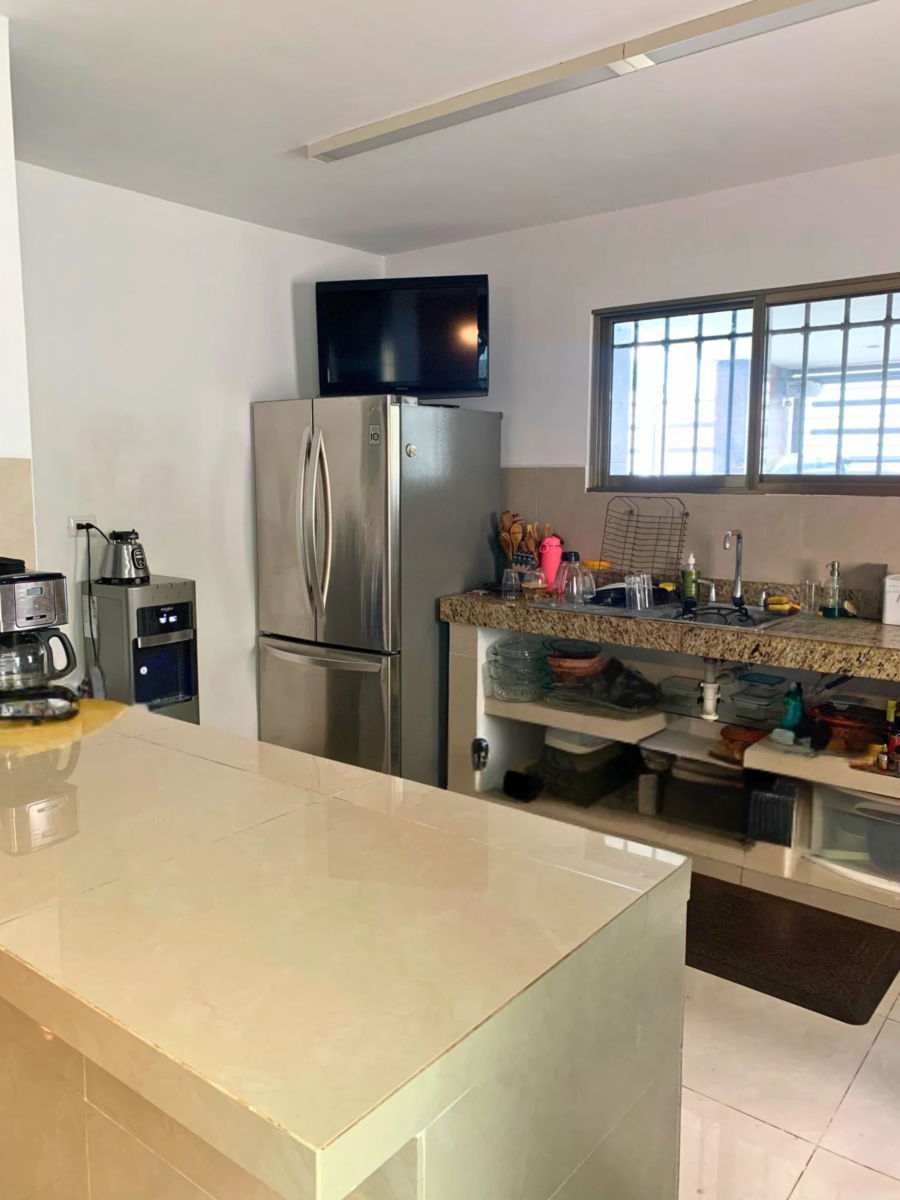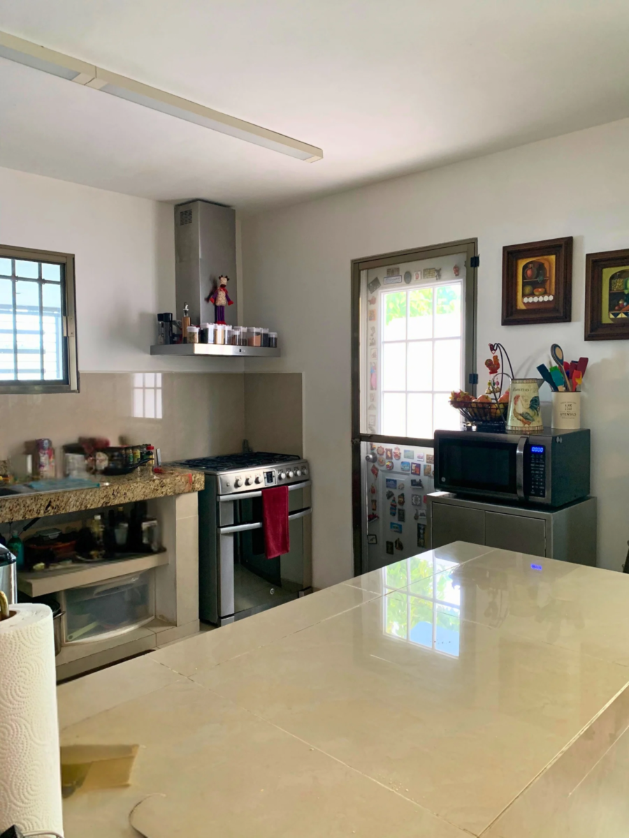- Cocina equipada con campana, barra desayunador, alacena y gavetas inferiores