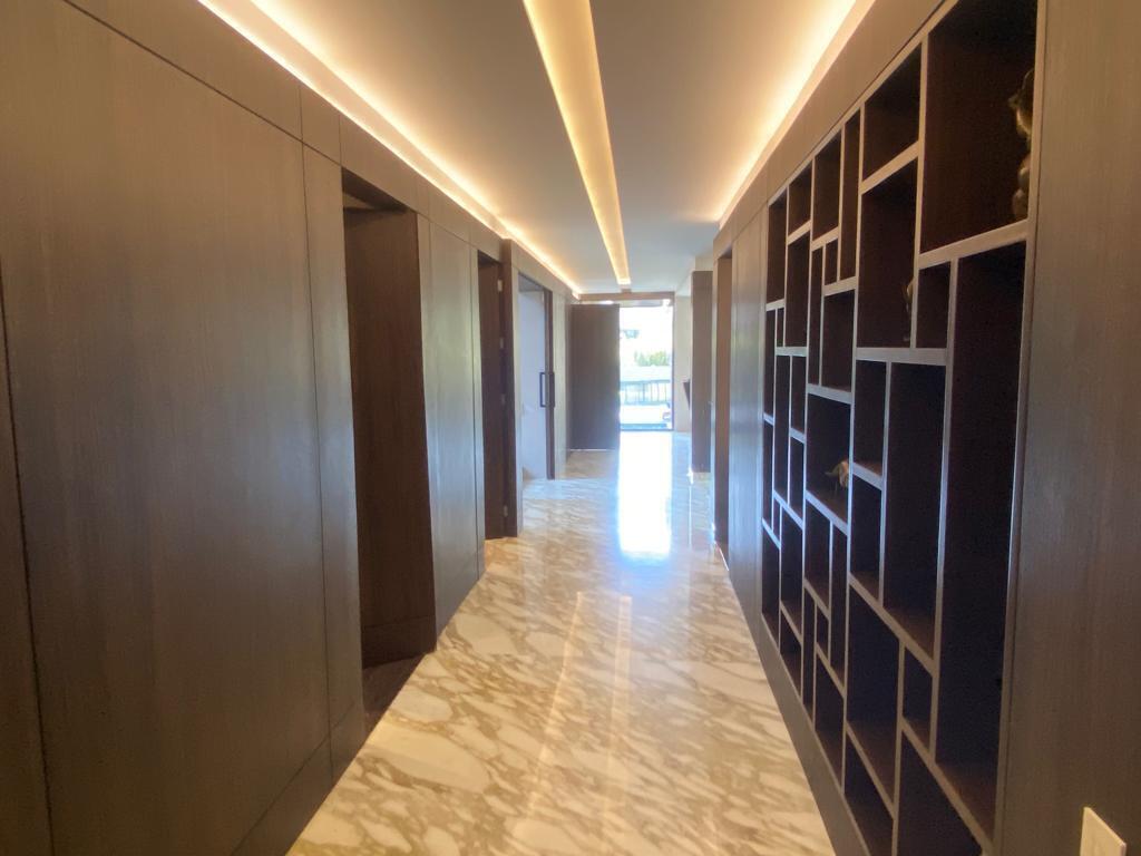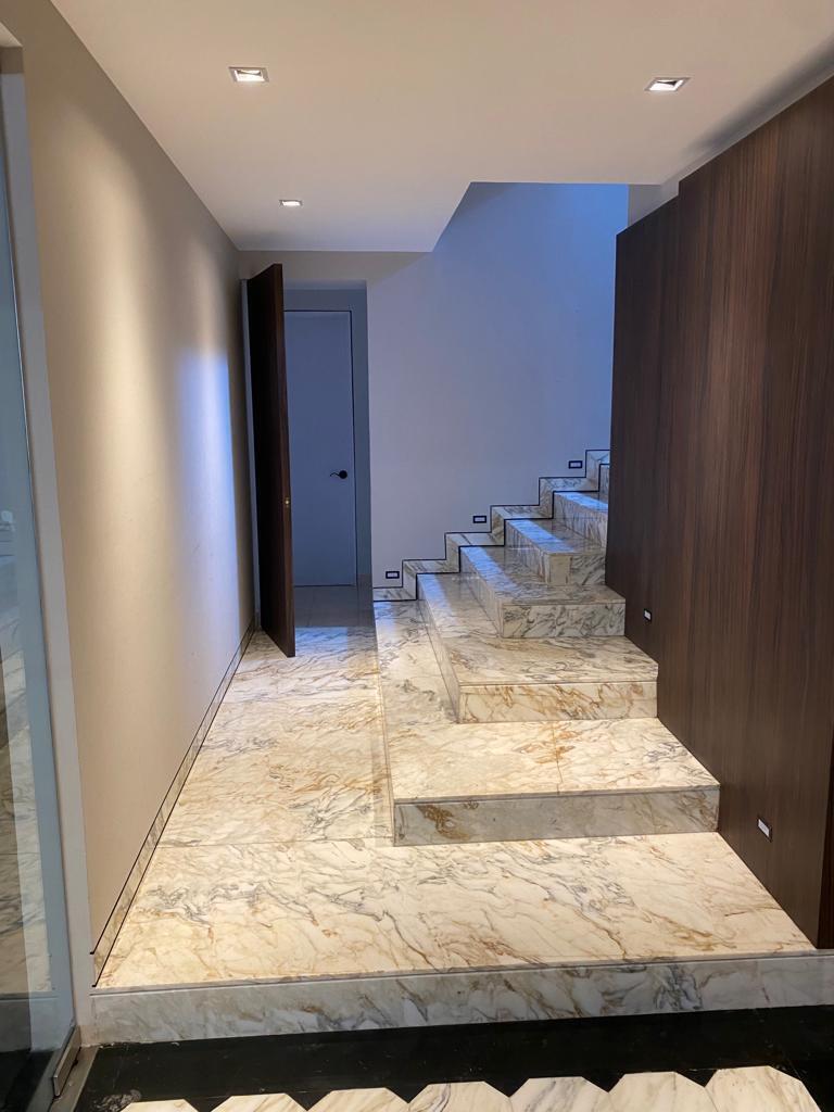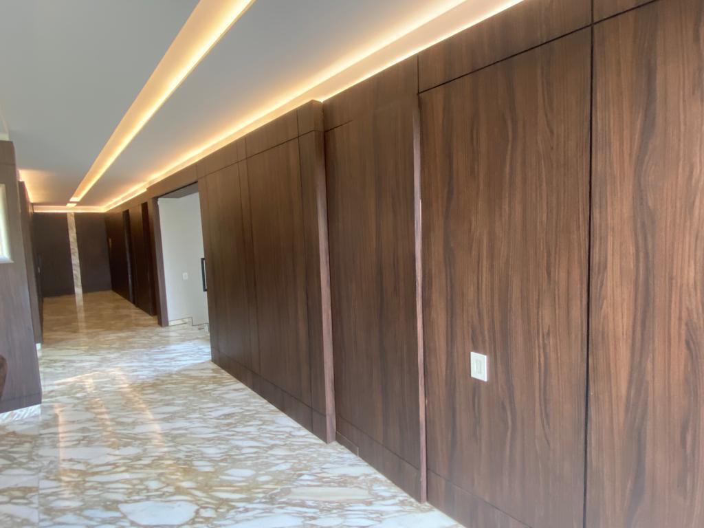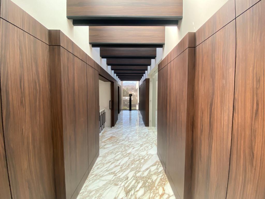 DESDE EL ACCESO PRINCIPAL, UN ESPECTACULAR PASILLO CON PISO DE MÁRMOL Y MUROS REVESTIDOS EN MADERA MARCA EL CARÁCTER DISTINTIVO DE LA CASA: ELEGANTE, CÁLIDO Y CONTEMPORÁNEO.