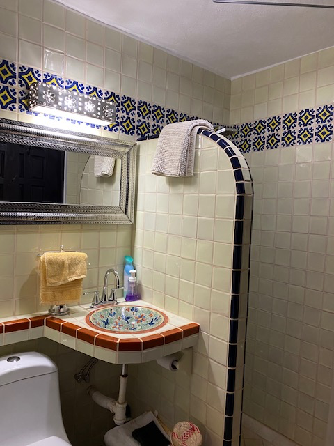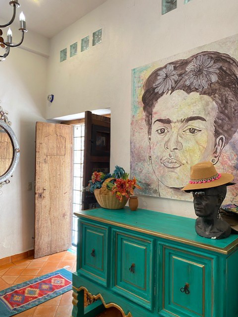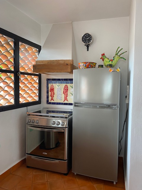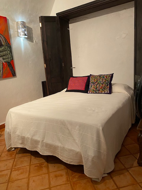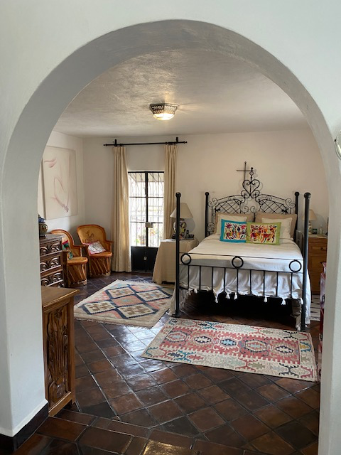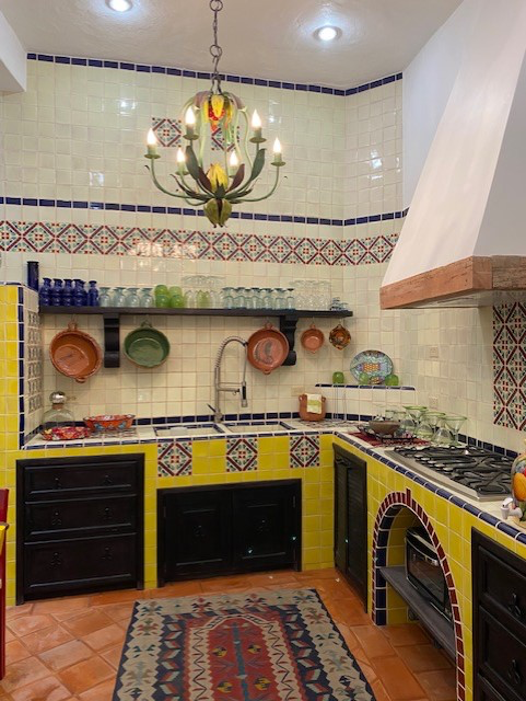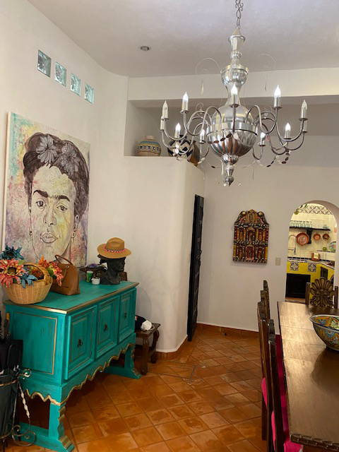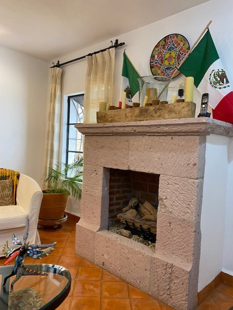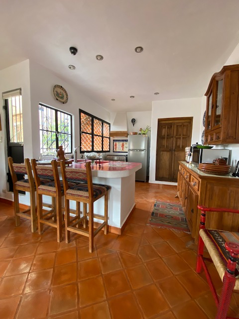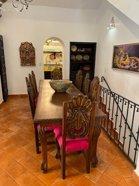 Upon entering through the old wooden door we find a warm living room with an electric fireplace, a spacious dining room and a dreamy Mexican kitchen, as well as a half bathroom.
