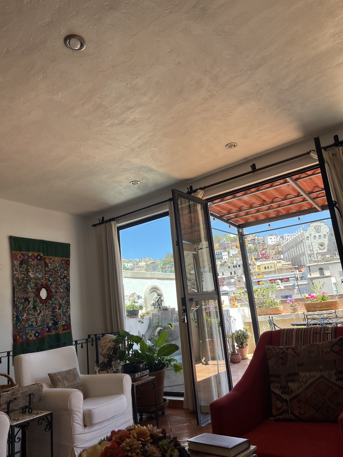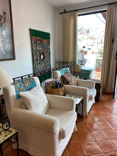 En segundo nivel encontramos una segunda cocina completamente equipada, una bella estancia y la magnífica terraza con fuente de cantera y la mejor vista de la Universidad de Guanajuato, la Basilica y el Pipila.