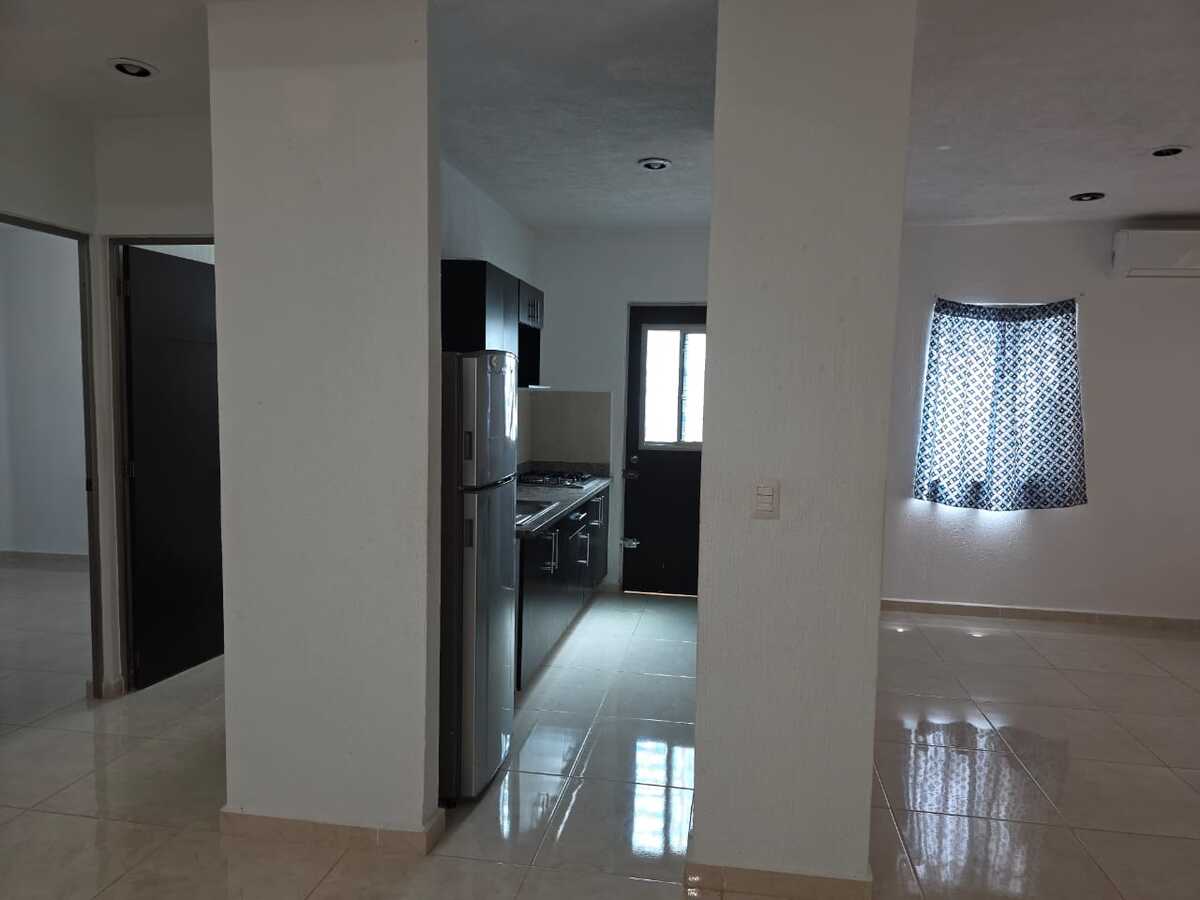 La casa tiene 2 recamaras, baño con cancel, sala amplia, comedor y cocina equipada con gavetas, alacena, barra desayunador y meseta de granito, bardas traseras y puerta en el pasillo de servicios.