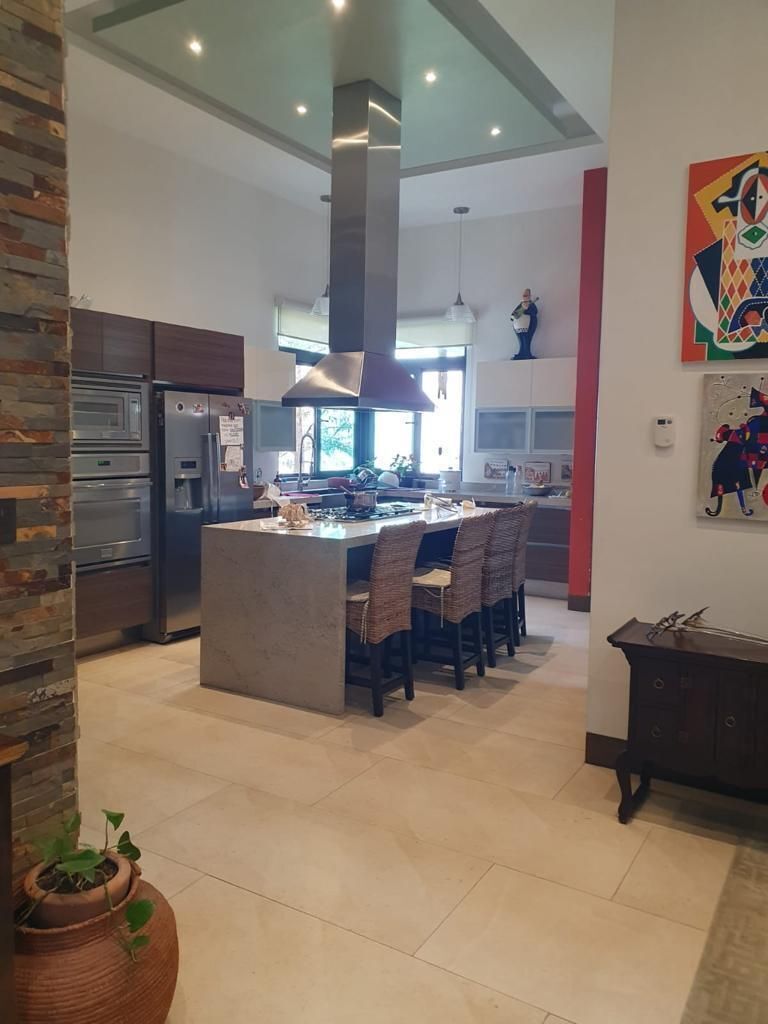 —Cocina integral con accesorios italianos y cubierta de granito y campana de acero inoxidable.