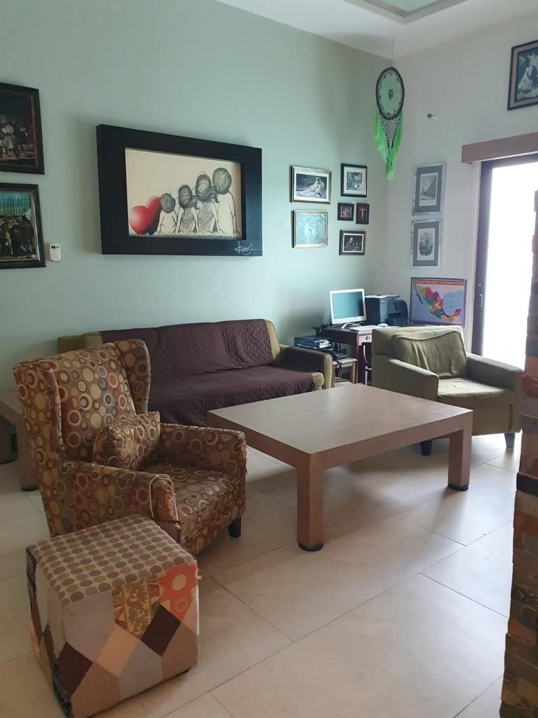 —Sótano acondicionado como estancia, oficina y sala de TV, con libreros integrados, escritorio y muebles extraíbles para guardar DVD y videos.