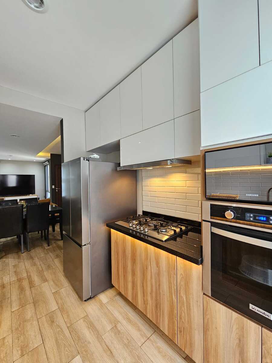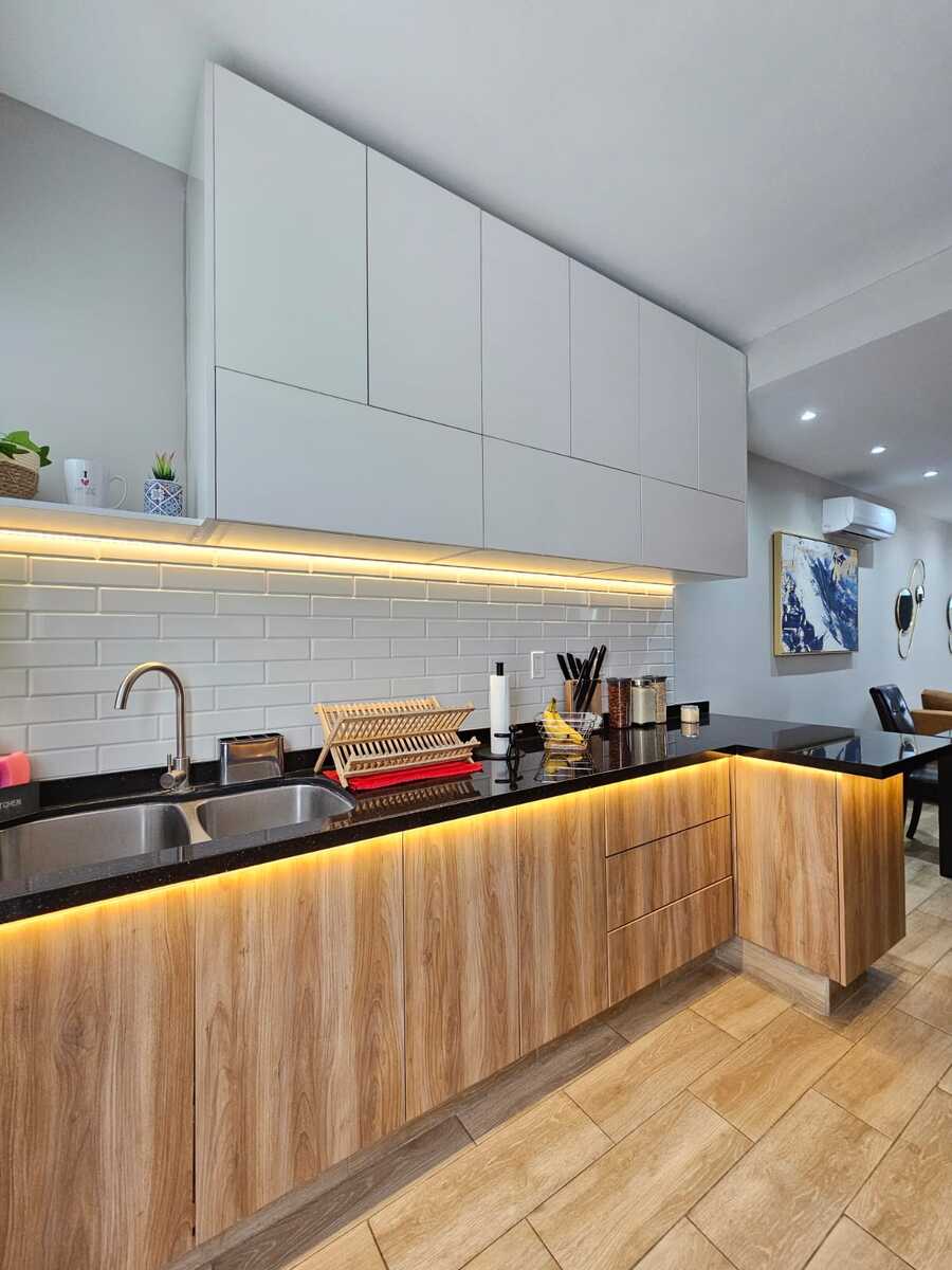 • Cozinha aberta com bancada e ampla despensa