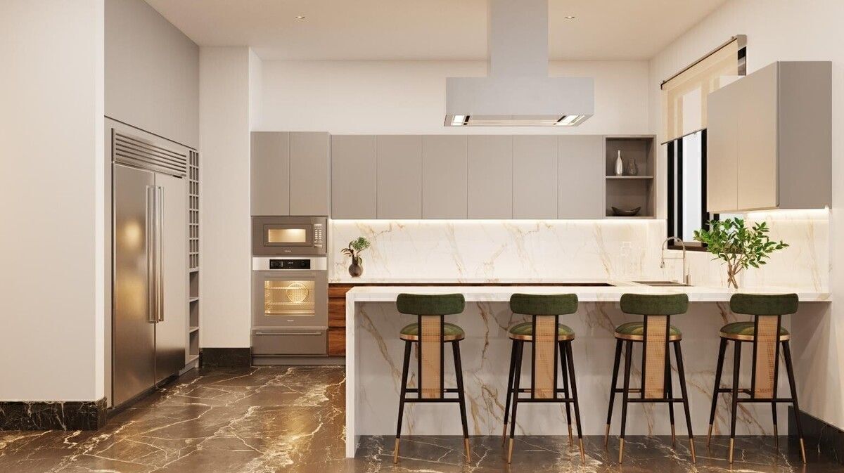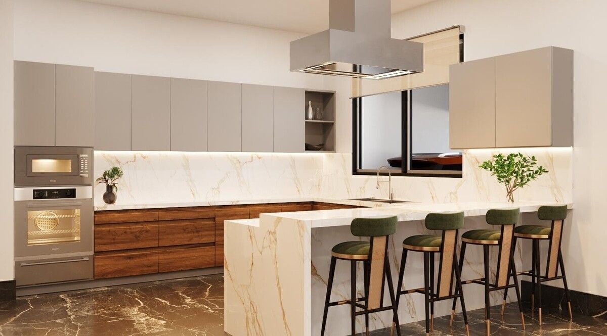 ✔ Cocina integral de diseño con isla y cubierta de cuarzo.