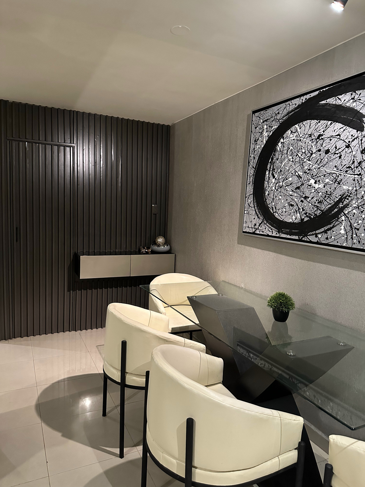 Equipado com mini-splits frio/calor na sala, estar e suíte principal. Divisórias de vidro temperado, persianas e cortinas em todas as áreas, câmeras de vigilância, preparação para alarme.