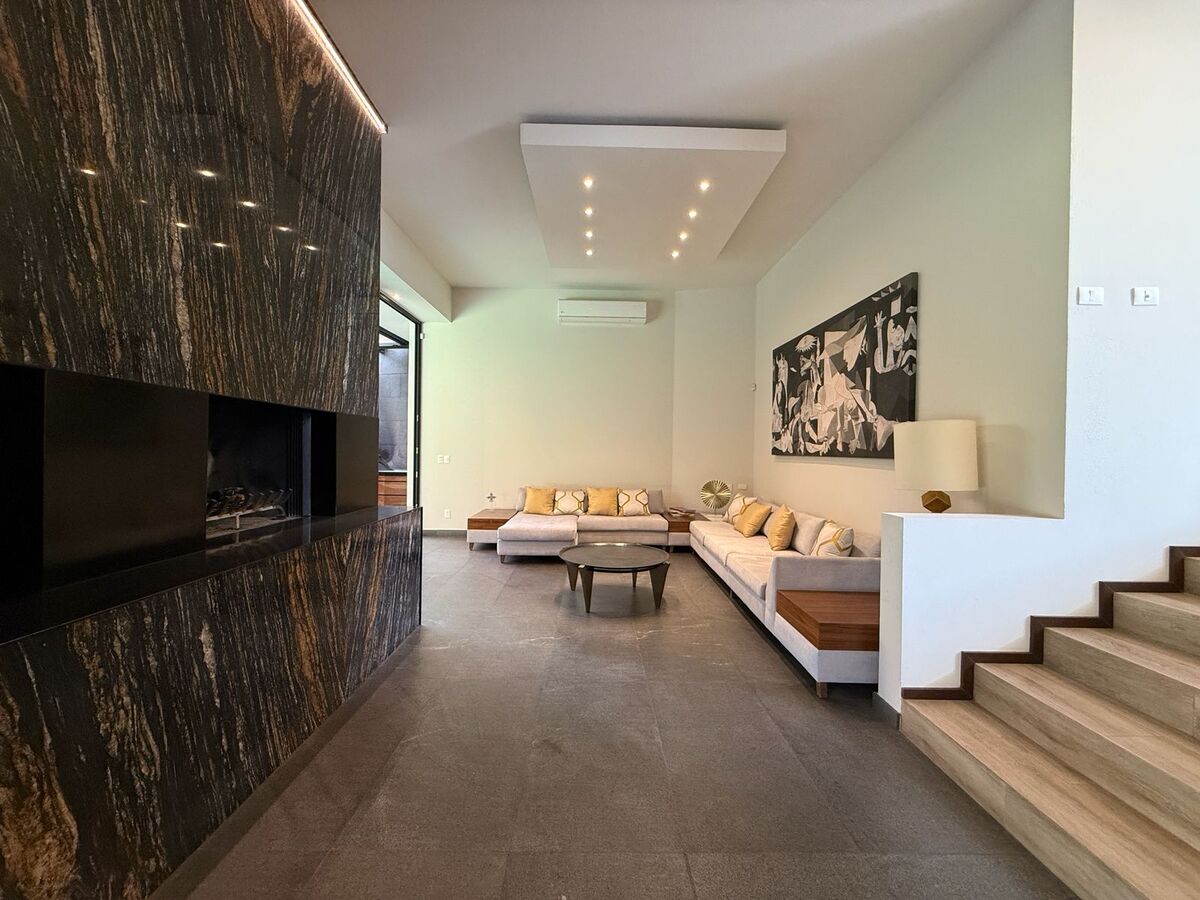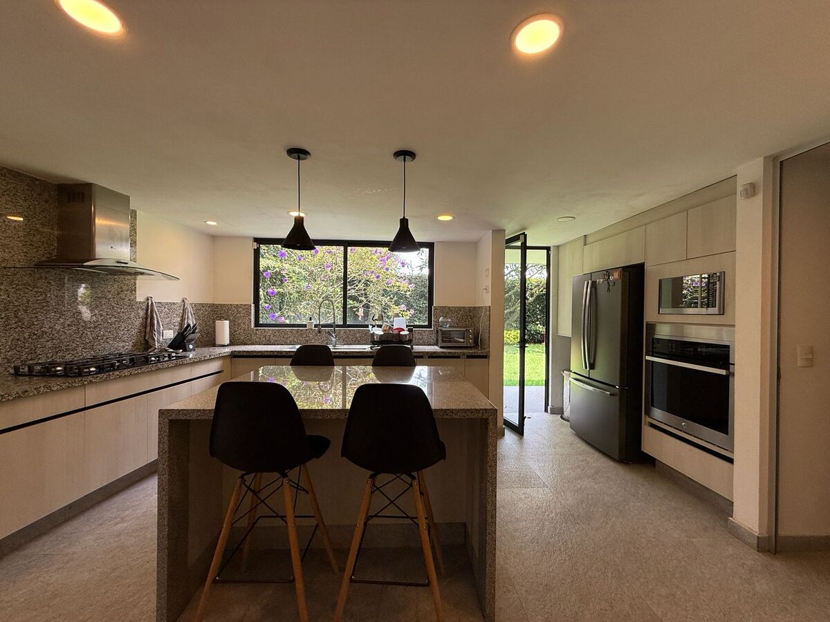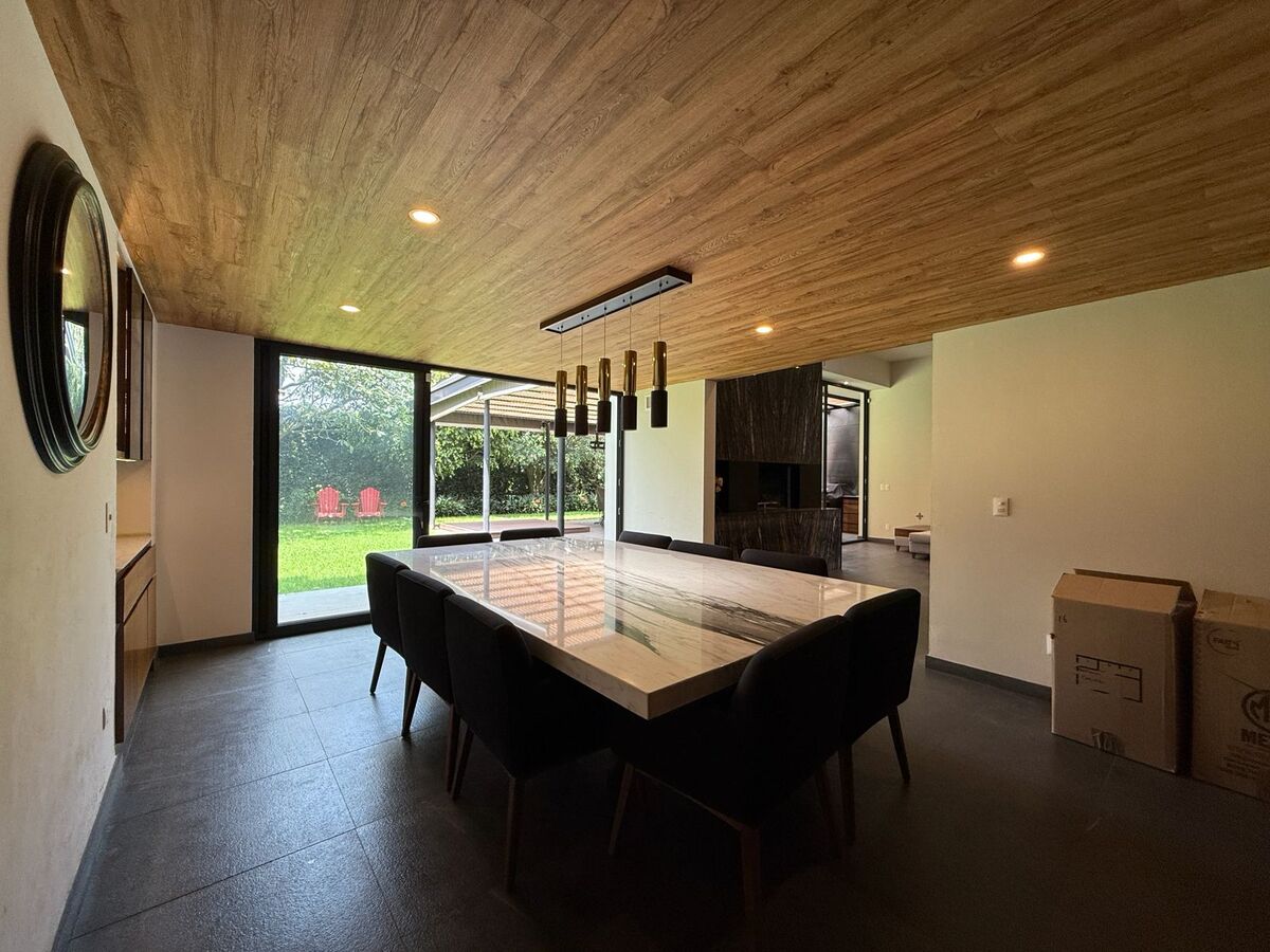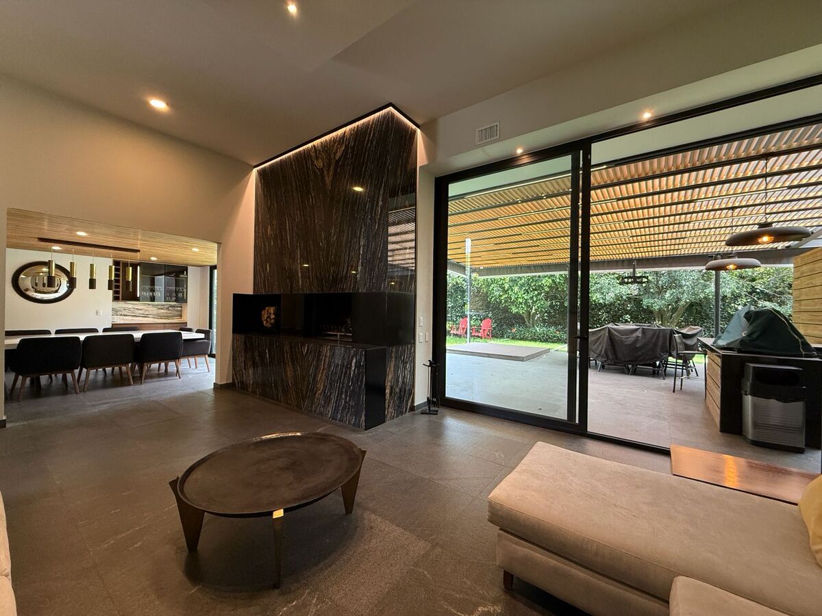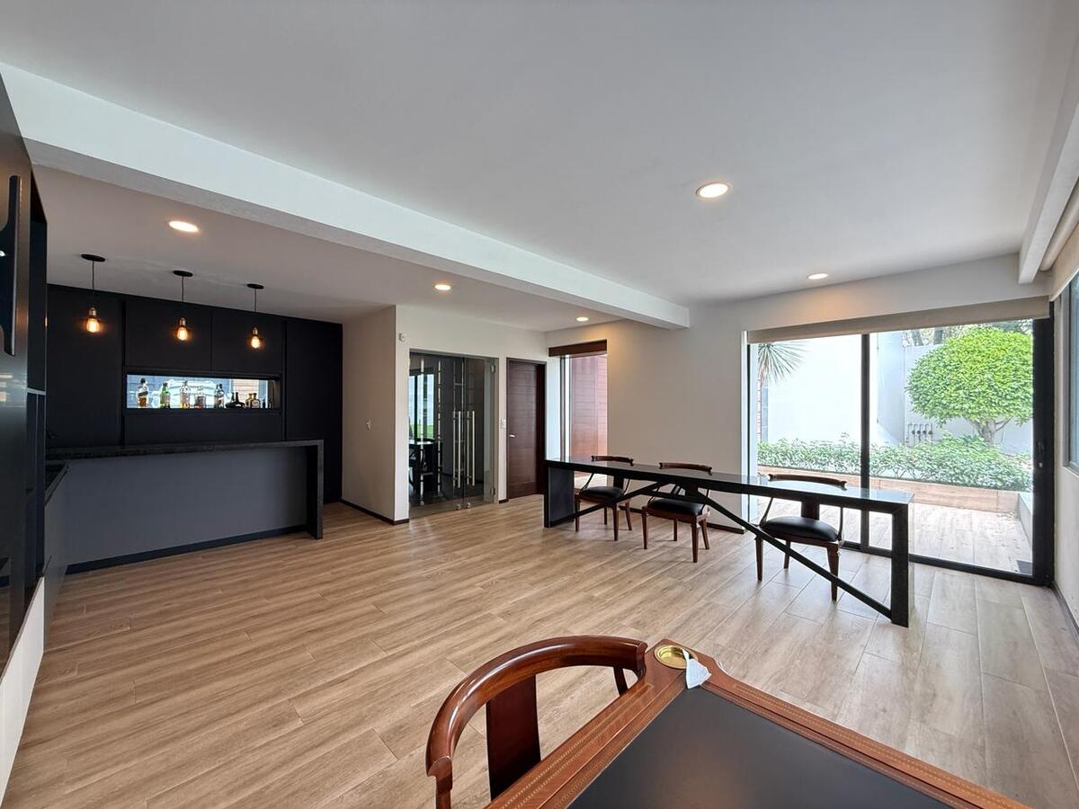 Vestíbulo a doble altura que da acceso al despacho, al family room con cava y bar, al baño de visitas y a la sala que tiene acceso al jardín y al área de terraza techada donde están los asadores, la sala y comedor exteriores y un amplio jacuzzi para 8 personas. El comedor también tiene acceso al jardín y al ante comedor y cocina que es amplia y con cubierta de granito. Hay un jardín al frente y otro atrás, ambos son planos.