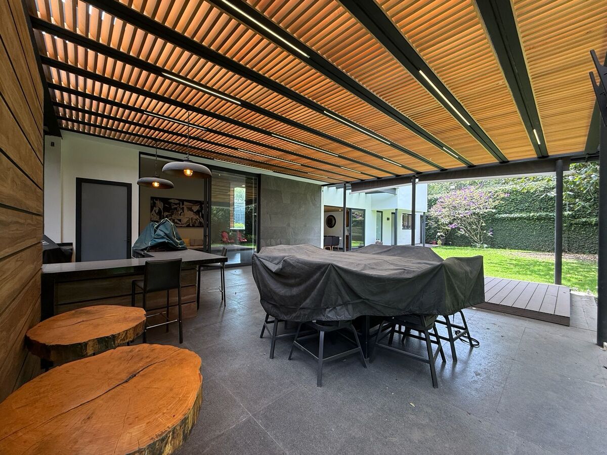 La casa tiene celdas solares y aire acondicionado en las recámaras y la sala. Sistema de captación de agua pluvial y filtrado para reutilización, persianas eléctricas en varias zonas. Riego por aspersión automatizado, conexión para autos eléctricos. Cerca electrificada y alarma.