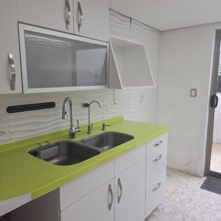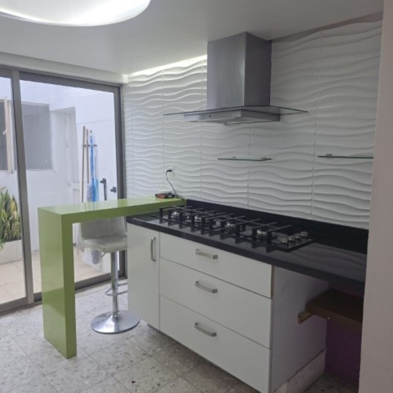 La estancia está distribuida en desniveles y la cocina integral cuenta con buena iluminación natural y artificial, espacio para lavavajillas, barra y espacios de almacenamiento.