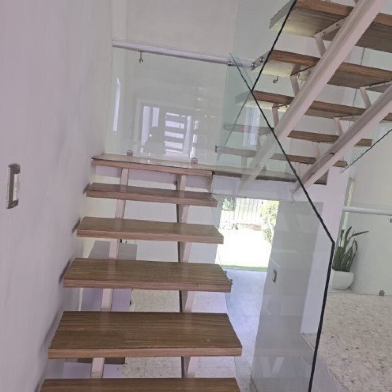 Para acceder a la planta superior, cuenta con escaleras con barandal de vidrio templado. En esta planta se ubican 2 recámaras, la principal con vestidor y baño completo con tina; y la recámara secundaria con clóset con luz interior.
