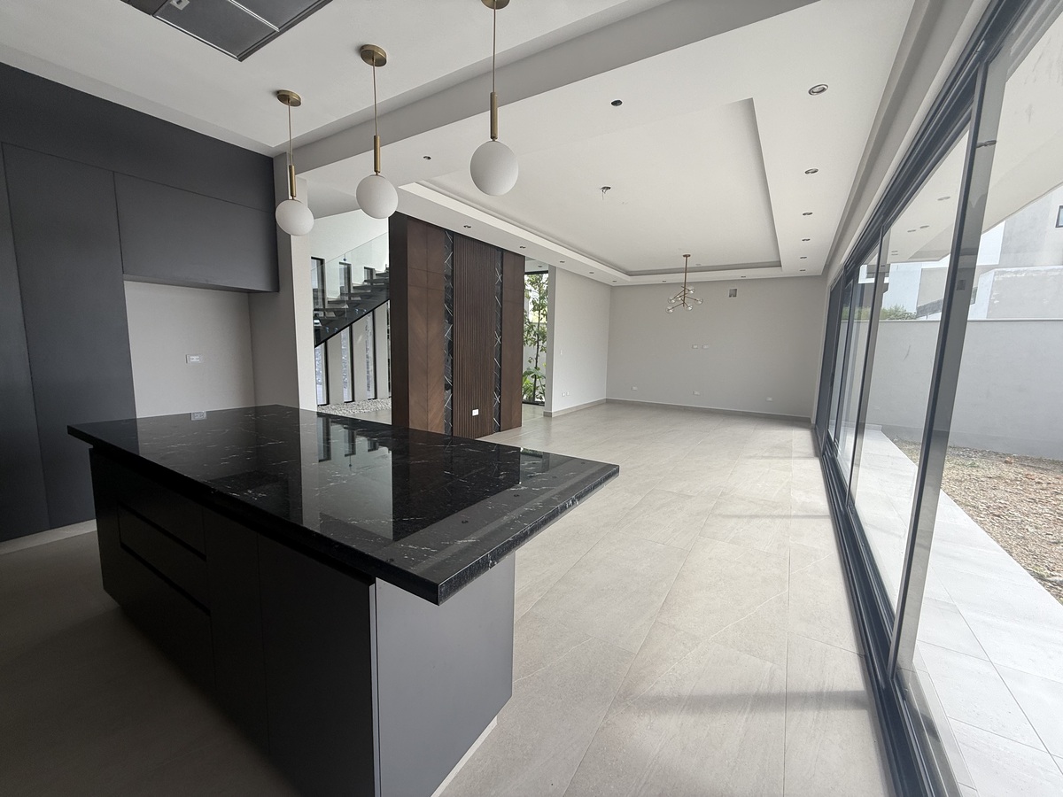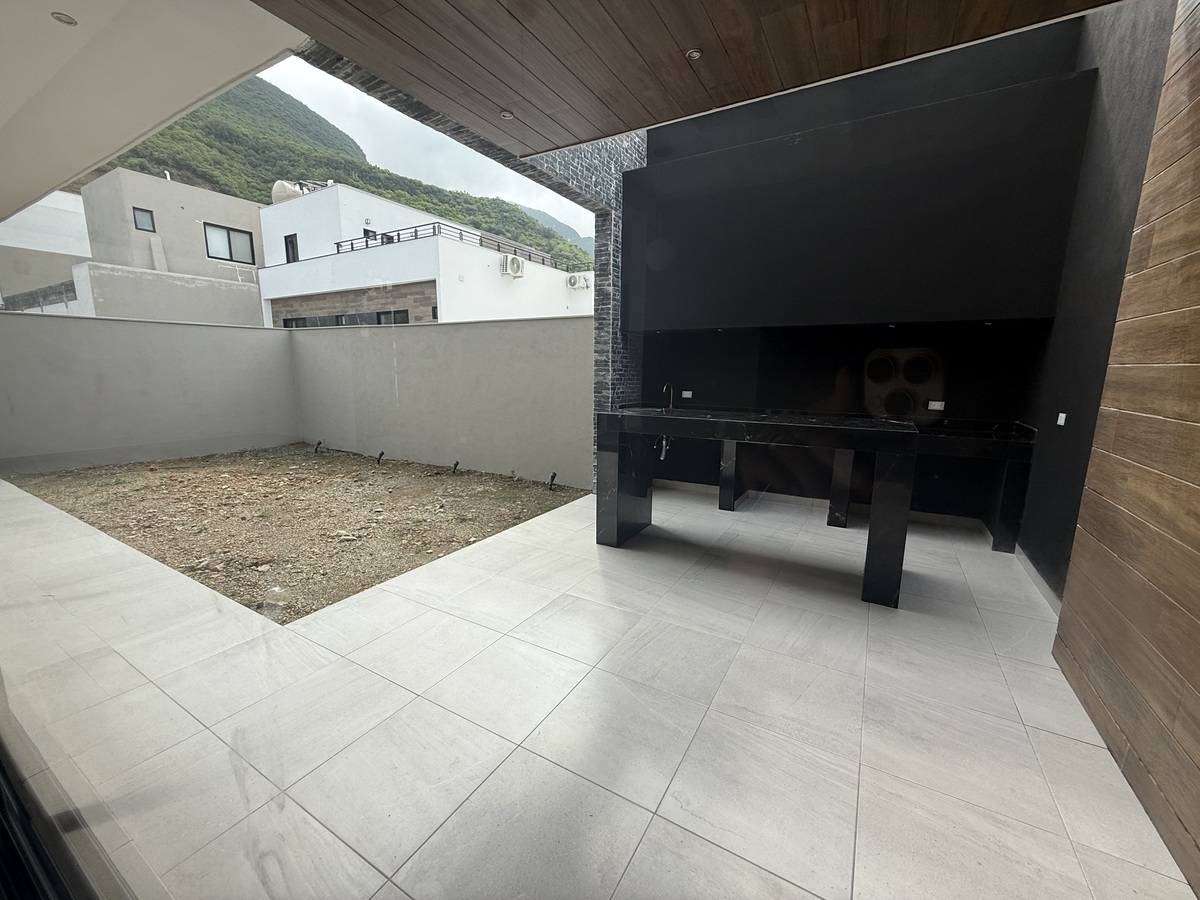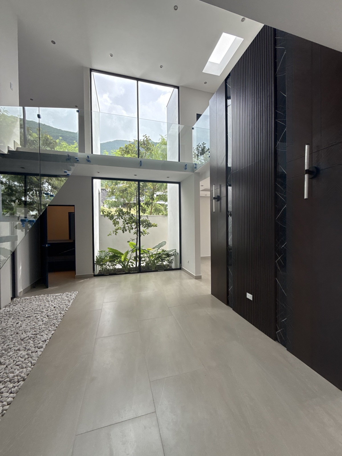 Recibidor doble altura Área de Sala Comedor y Jardín con terraza con barra de granito y preparación para asador. Jardín Interior y exterior de 142 mts .