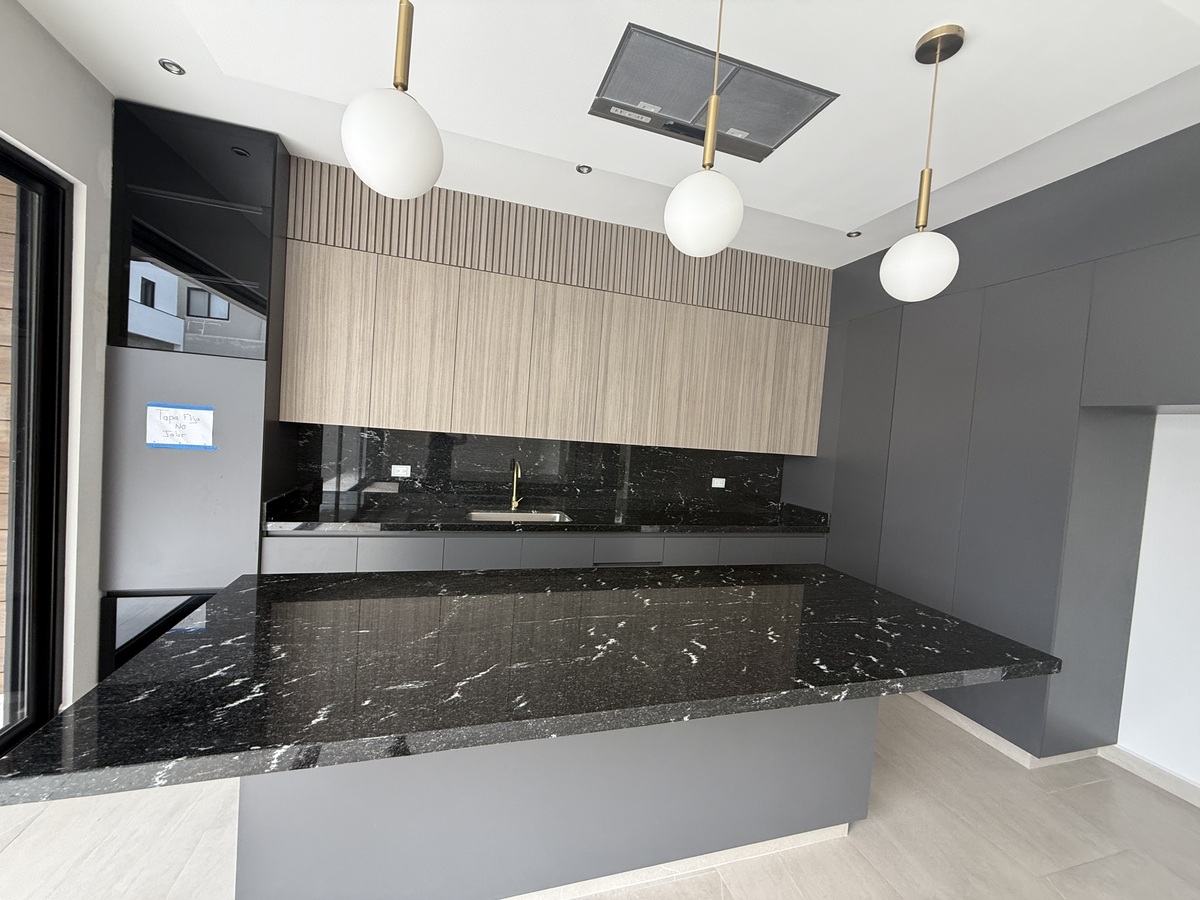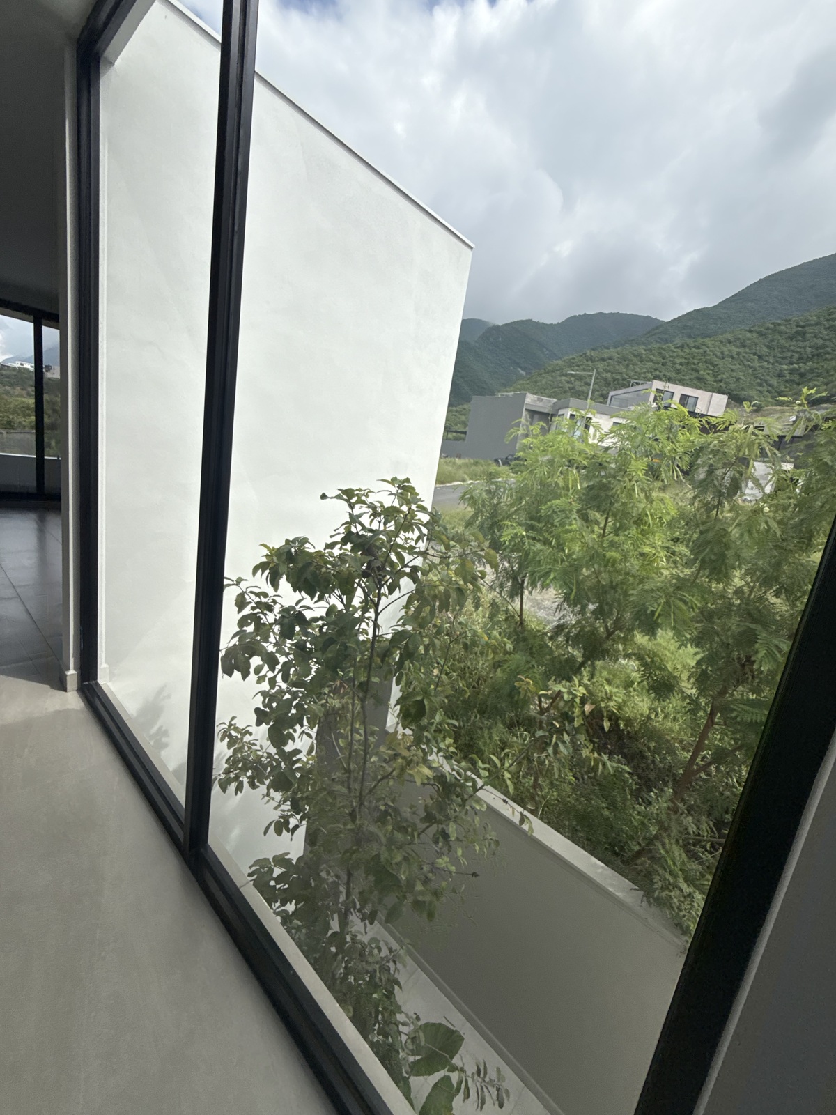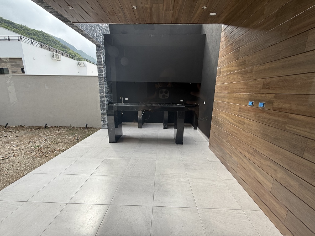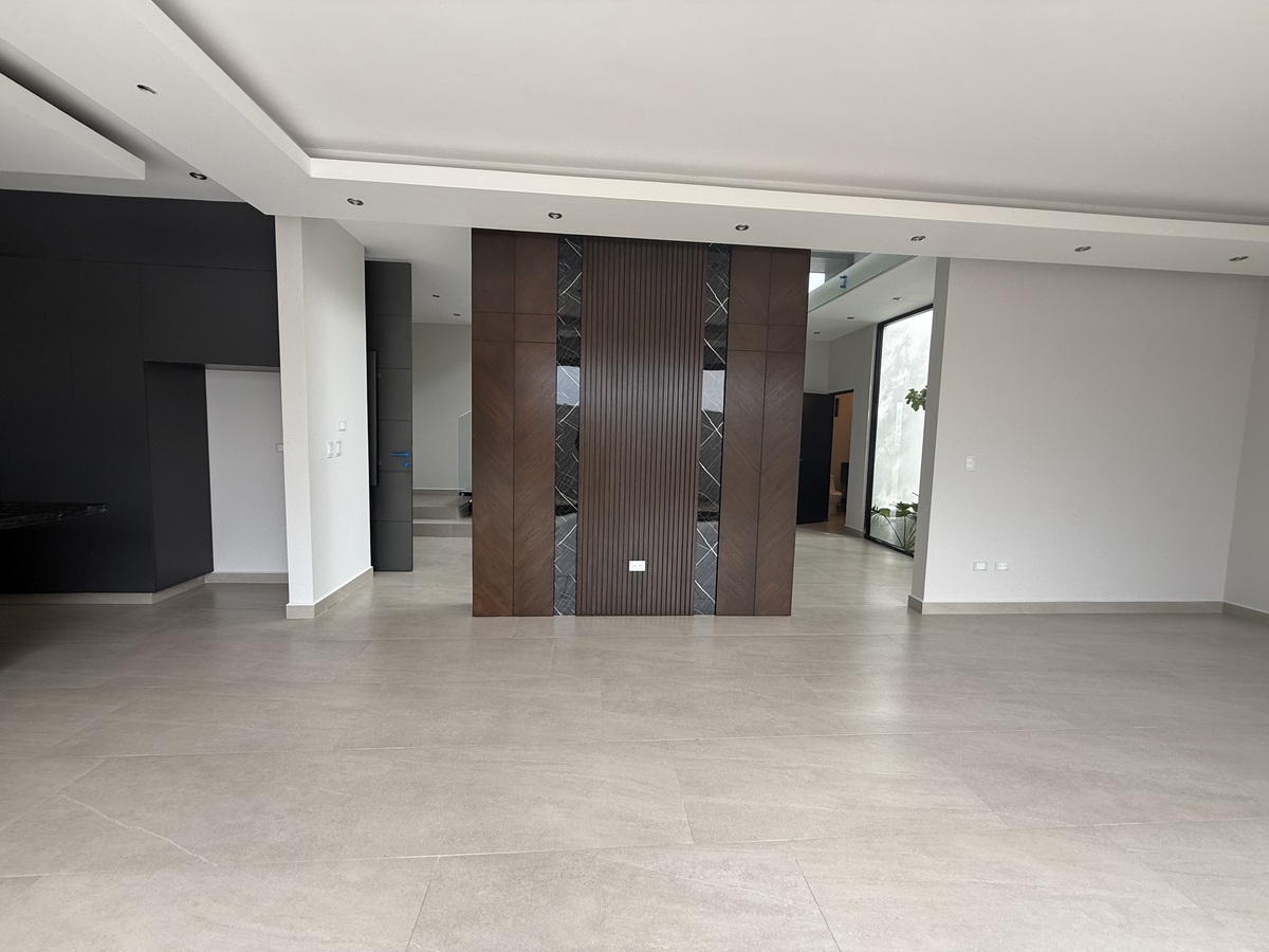 Recibidor doble altura Área de Sala Comedor y Jardín con terraza con barra de granito y preparación para asador. Jardín Interior y exterior de 142 mts .
