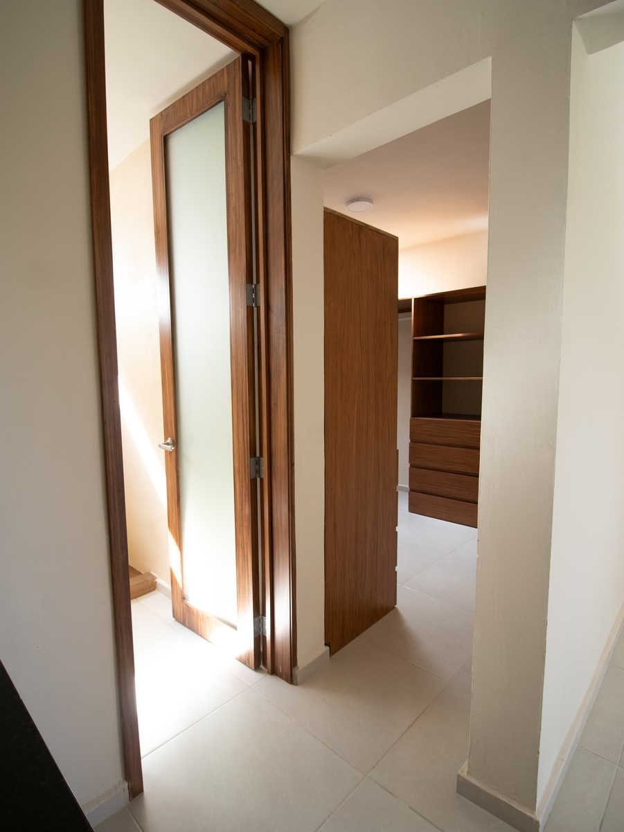 • 3recámaras,laprincipal, en planta alta, con baño completo y amplio vestidor, carpintería completa con2cajoneras, maleteros y tubos para ropa.