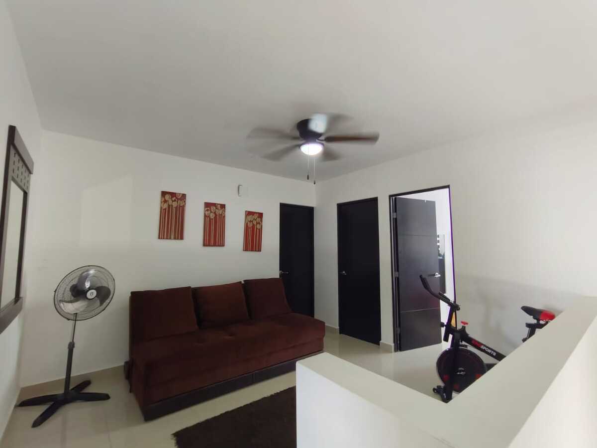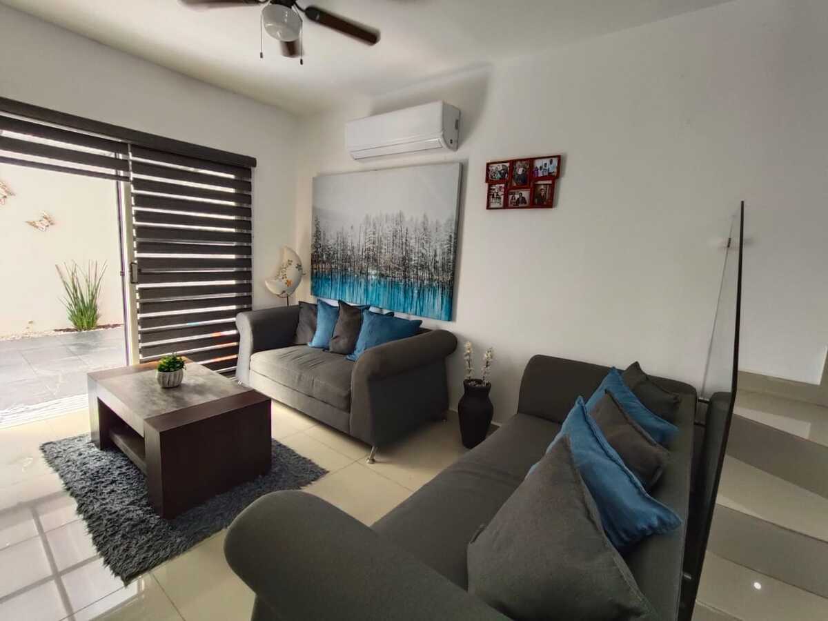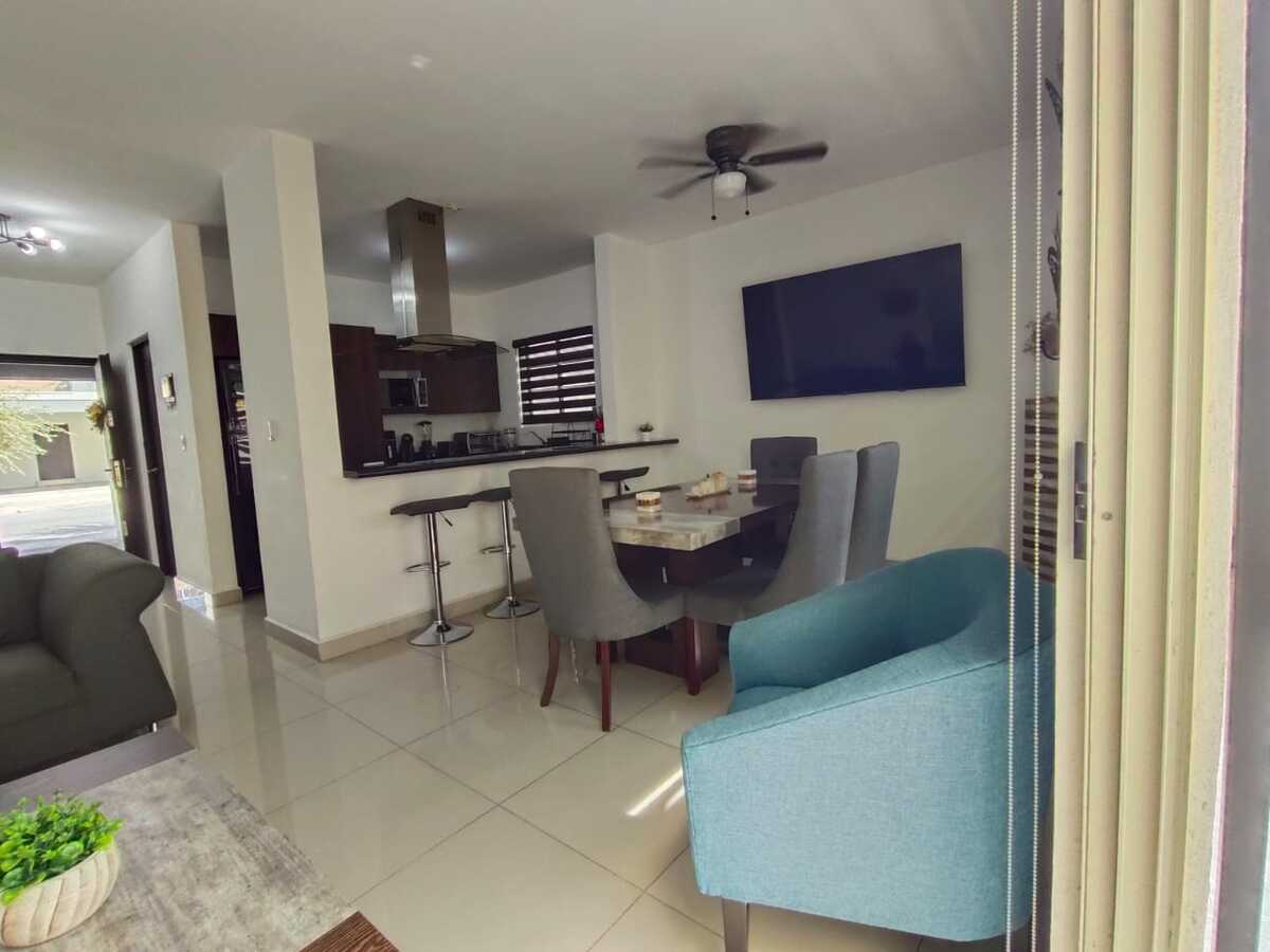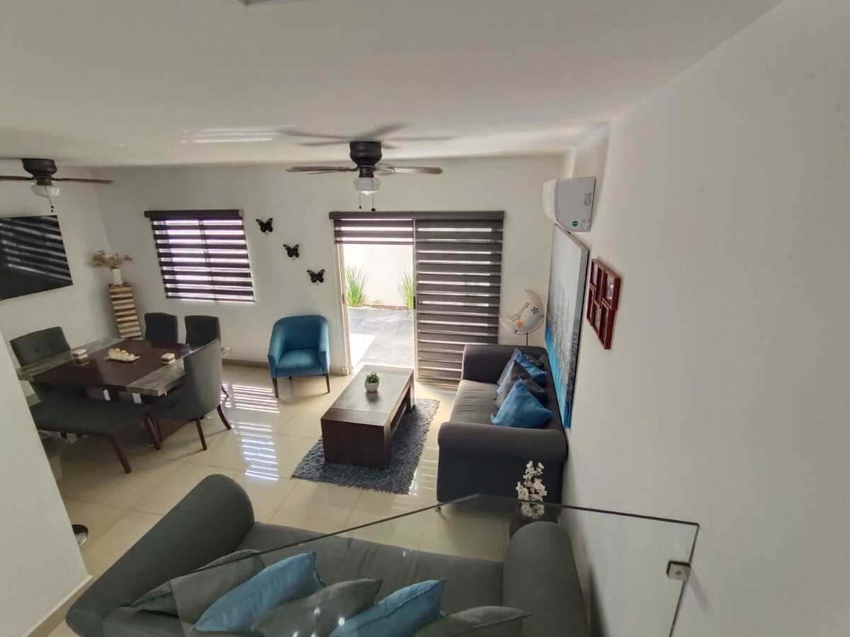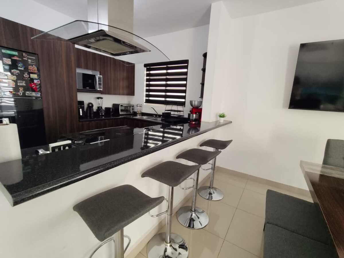 Muebles y equipo: cocina con estufa y campana, 4 minisplit, boiler, protectores, persianas, ventiladores de techo, closets, cancel de escalera y baños, lampara de 6 focos en entrada.