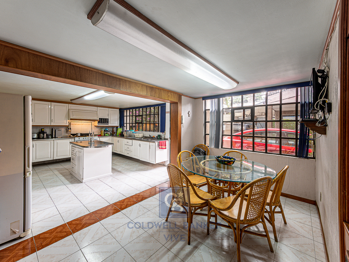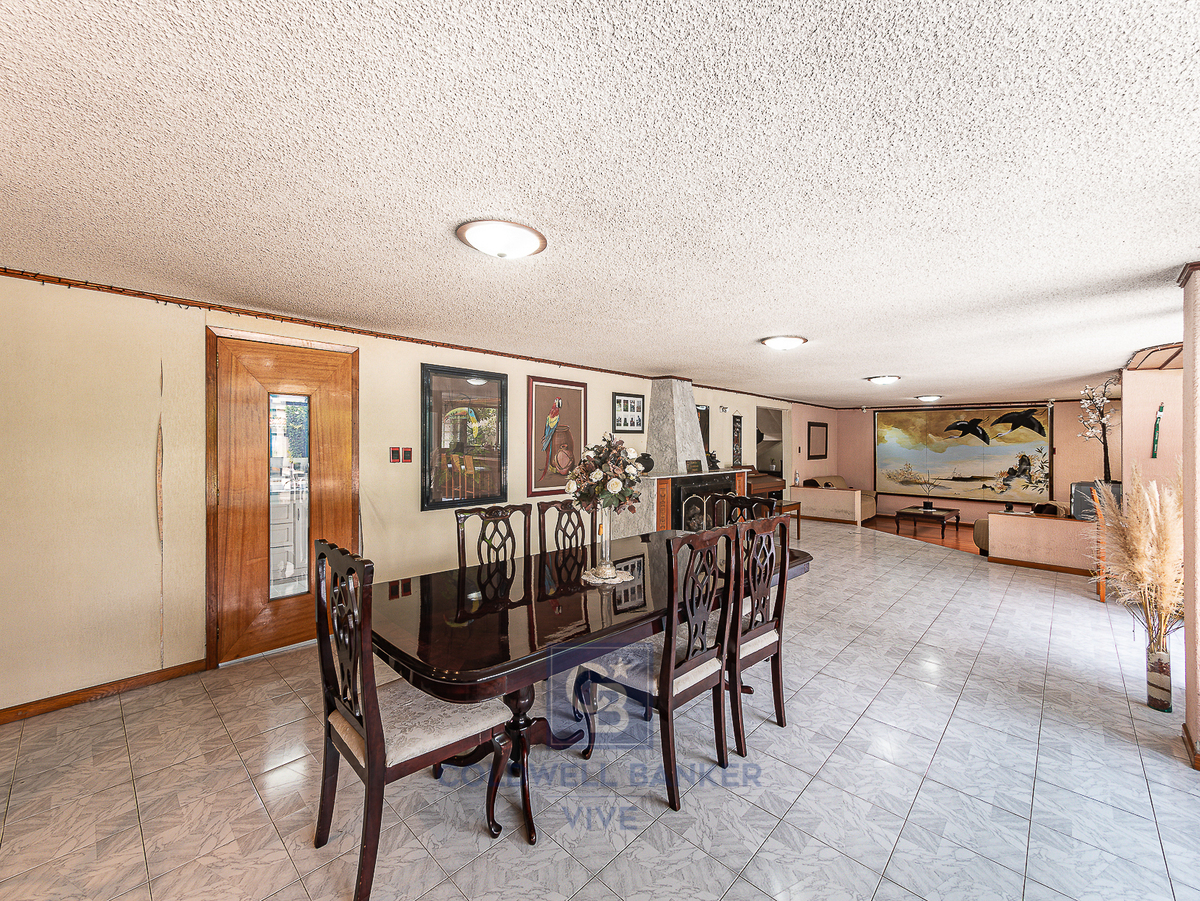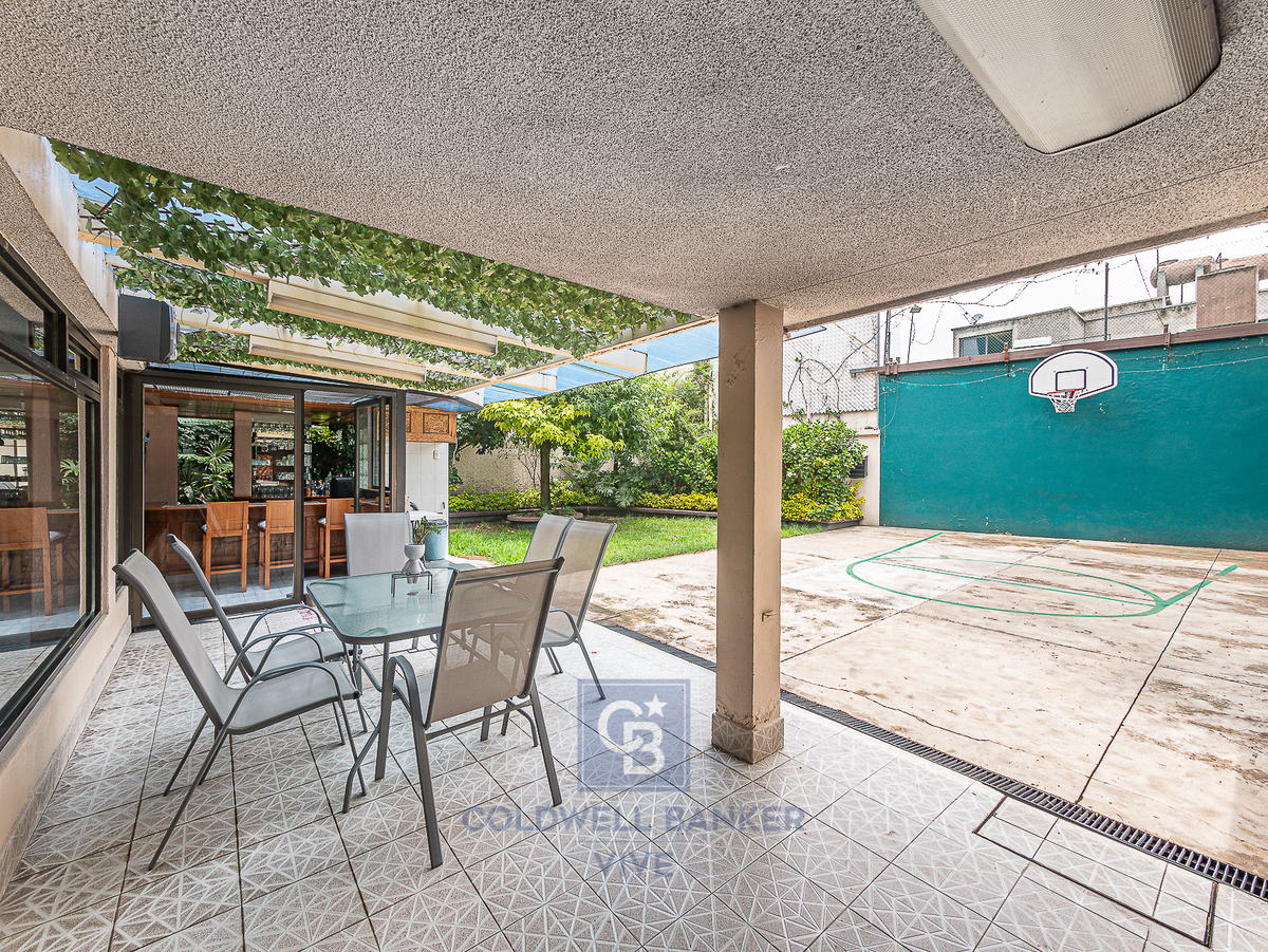 Cuenta en planta baja con recibidor, medio baño, sala con un bar y jardín interno, comedor con capacidad de 8 a 12 comensales, cocina integral abierta con isla como desayunador y un antecomedor con alacena; tiene acceso al jardín con una terraza techada y media cancha de básquet.