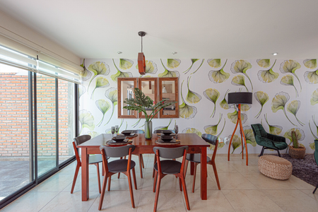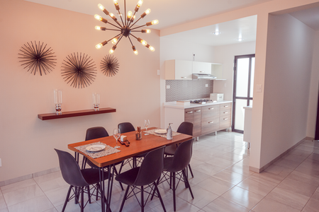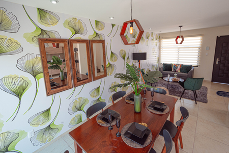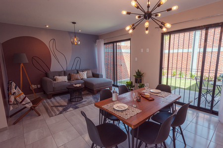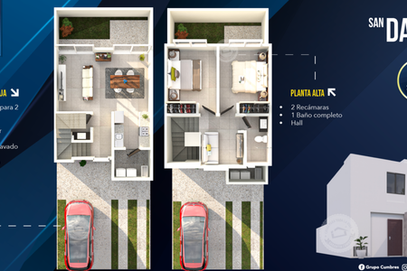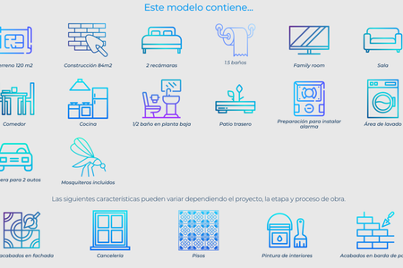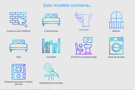 Planta baja: Sala- comedor, cocina integral con estufa de 6 quemadores cerrada con alacena, patio de lavado techado, domo corredizo, patio trasero con asador y tarja, cochera para 2 autos con portón eléctrico y medio baño.